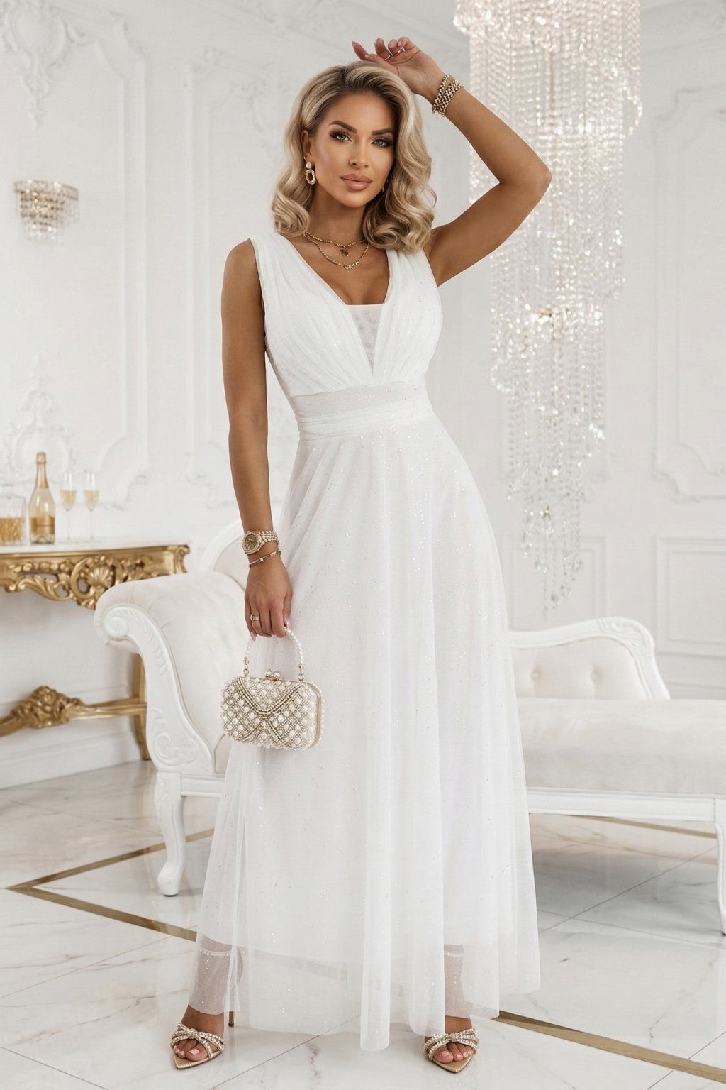Tieto šaty sú stelesnením pôvabu a nadčasovej elegancie. Ich jemne lesklý materiál vytvára dojem luxusu, zatiaľ čo ženský strih s dôrazom na detaily zvýrazní siluetu s vkusom a noblesou. Dokonalá voľba pre nevesty, ktoré preferujú decentnosť a zároveň chcú zanechať nezabudnuteľný dojem. Materiál šiat je elastický a na prsiach sú vystužené.