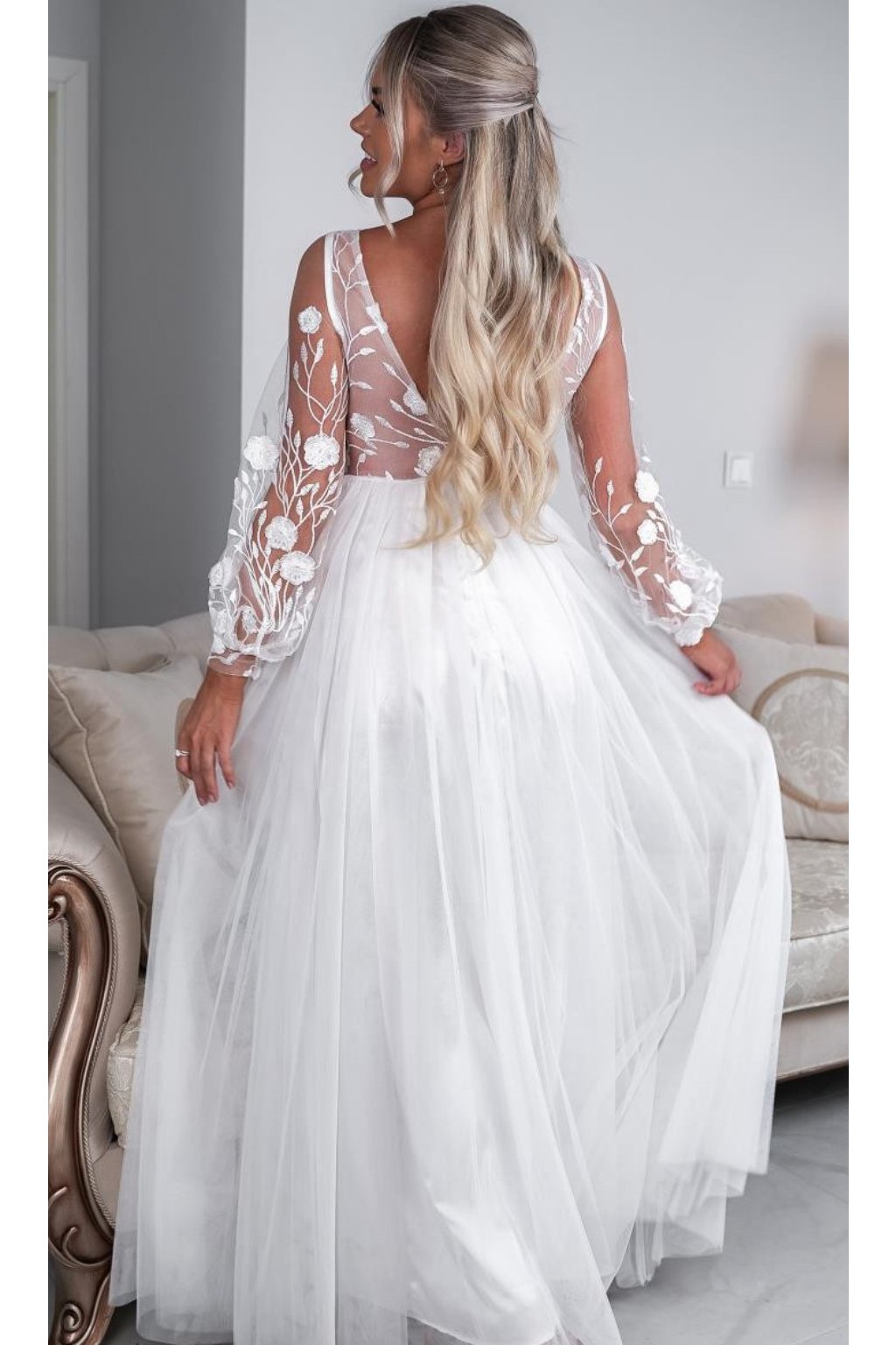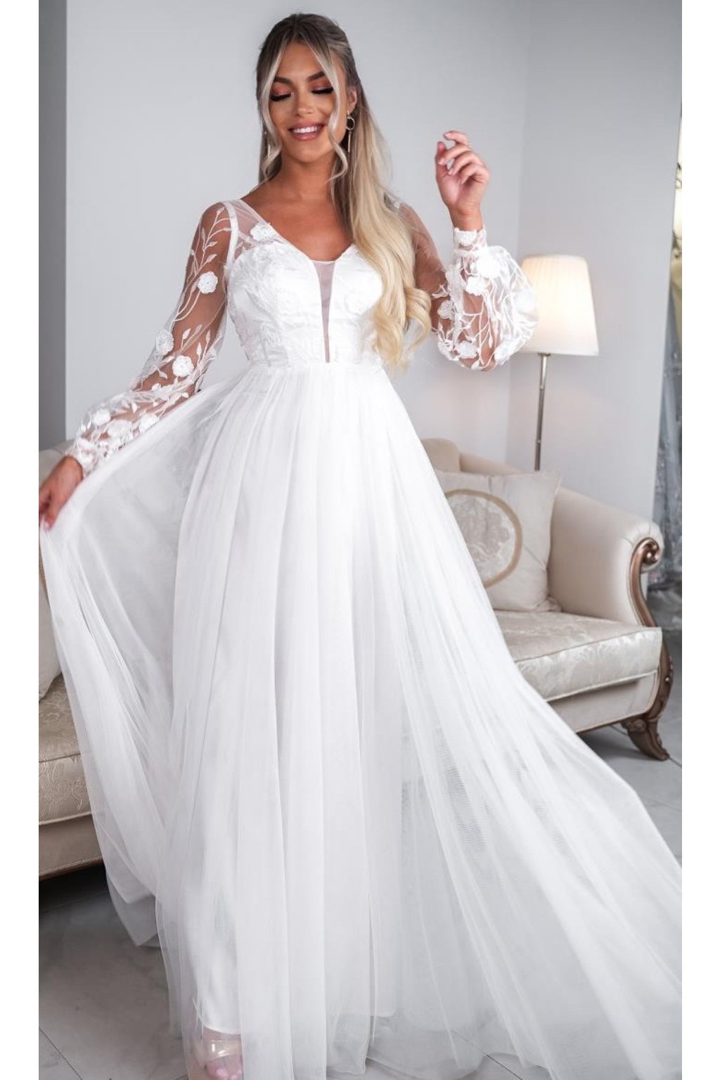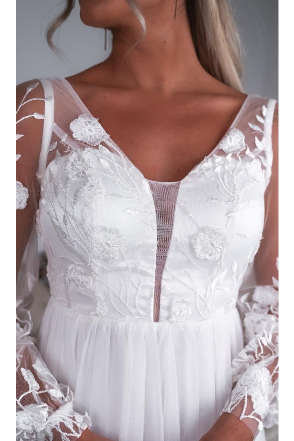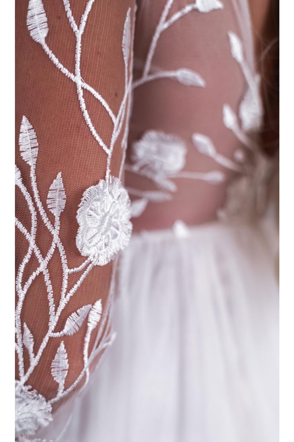 Romantické vyšívané kvetinky, nadýchaná tylová sukňa – kombinácia, ktorá pritiahne zrak každého v miestnosti. Vzadu sa šaty zapínajú zipsom a na prsiach sú vystužené.