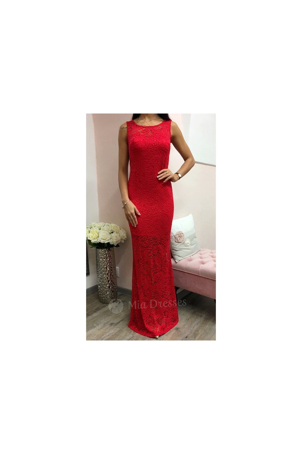 Červené čipkované spoločenské šaty