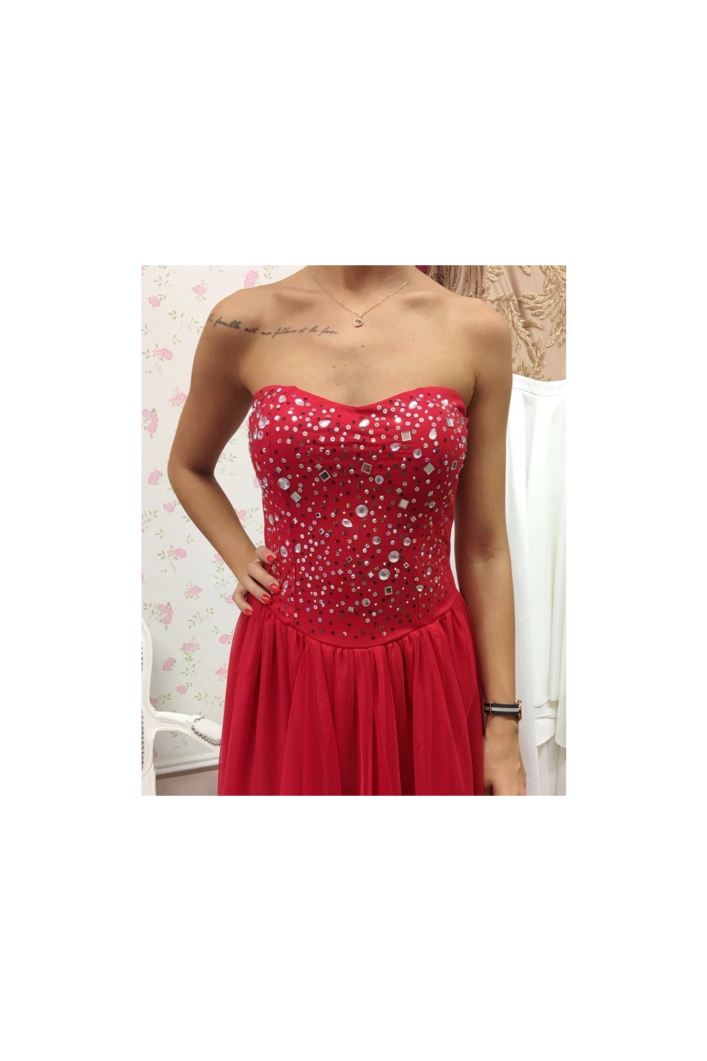 Zažiarte, v týchto šatách to pôjde ľahko. Kamienky na vrchnej časti sa krásne ligocú, tylová sukňa zase celý look zjemňuje. Sukňu tvorí spodnička a dve tylové vrstvy. Cez prsia sú vystužené, vzadu je zapínanie na zips. V tomto úchvatnom kúsku okúzlite na stužkovej, plese, či svadbe.