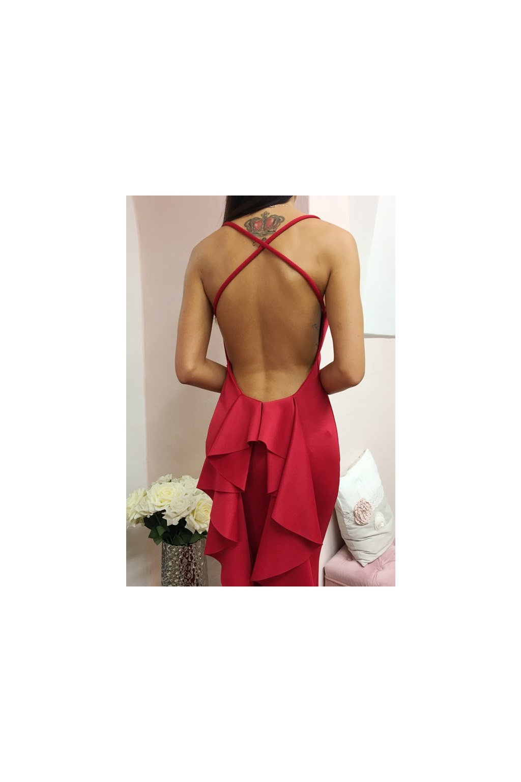 Červené spoločenské šaty s mohutným volánom