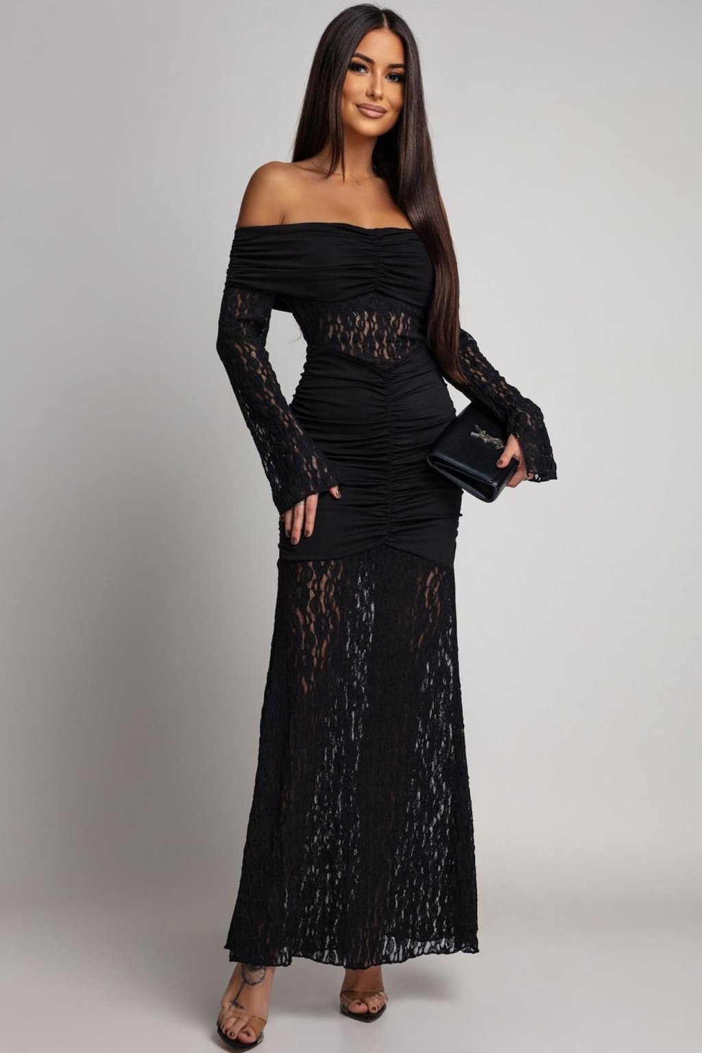 Tieto šaty sú synonymom luxusu a večernej elegancie. Obtiahnutý strih dokonale kopíruje siluetu a romantická čipka dodáva modelu zvodný a sofistikovaný nádych. Ideálna voľba na výnimočné večery, kde chceš zažiariť. Materiál šiat je elastický.