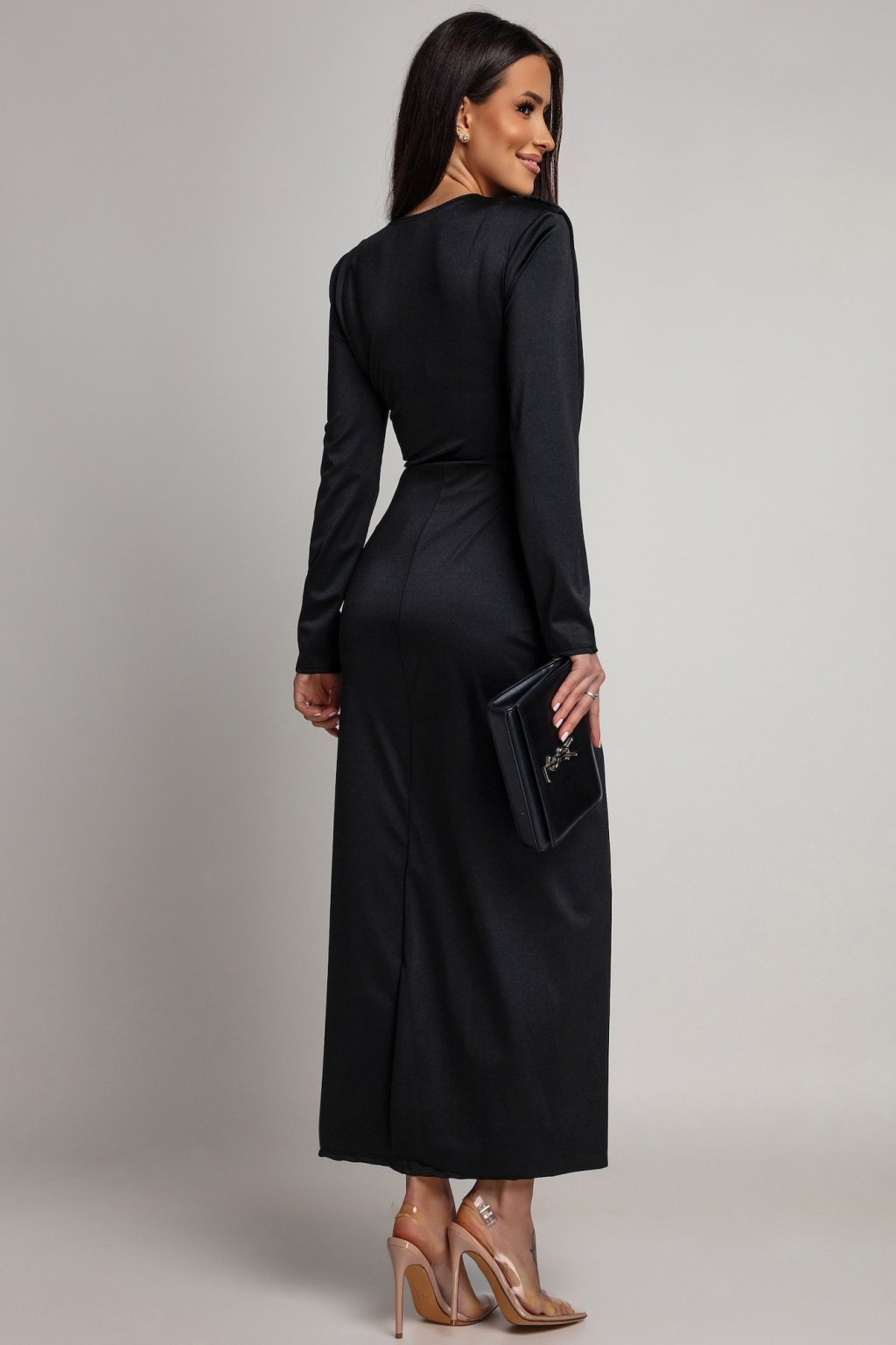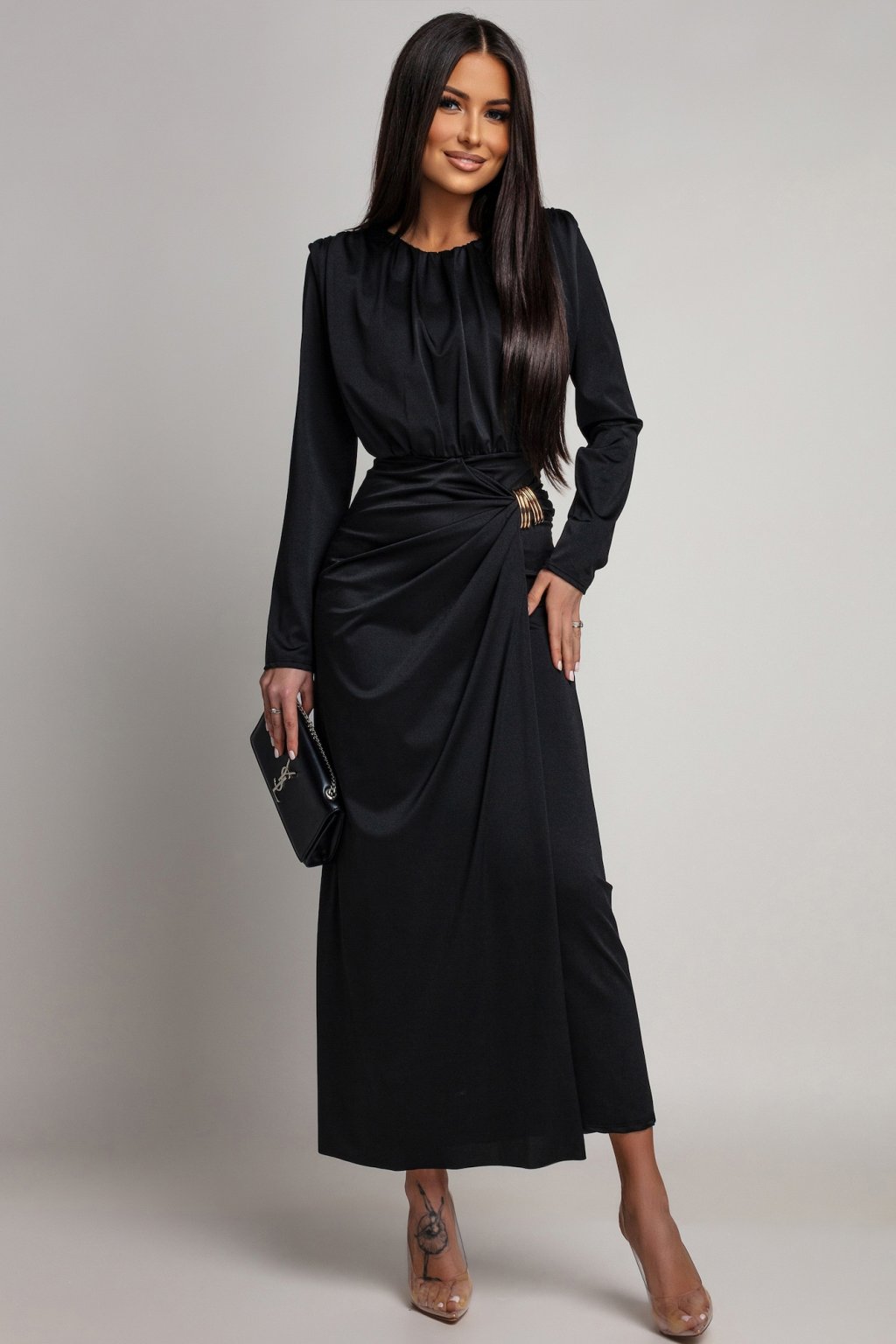 Tieto šaty pôsobia ako kúsok, ktorý si pýta pozornosť svojím sofistikovaným, luxusným dojmom. Ich elegantná silueta podčiarkuje ženské línie s nenútenou noblesou a celkový vzhľad vyžaruje prestíž a zmyselnú eleganciu. Materiál šiat je elastický.
