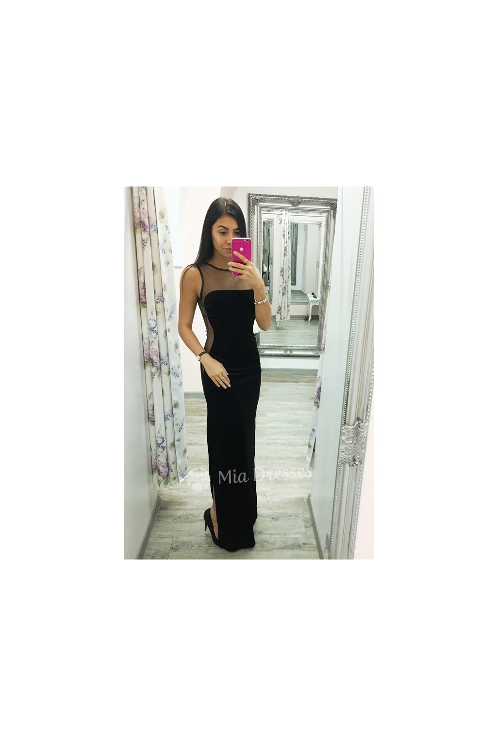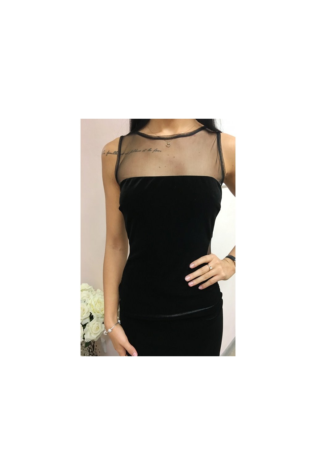 Sexi čierne šaty, z obľúbeného zamatového materiálu sú kombinované s priesvitným tylom, ktorý siaha cez celý chrbát. Vkusne odhaľujúce rafinované rozparky, po stranách, si podmania každý pohľad. Materiál je elastický.