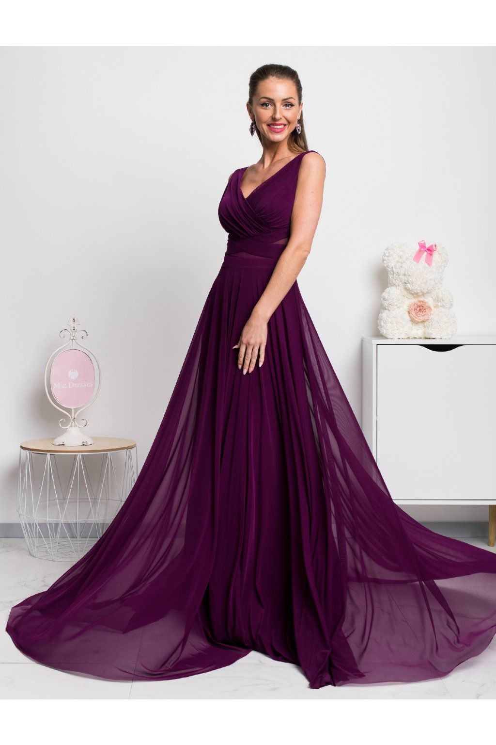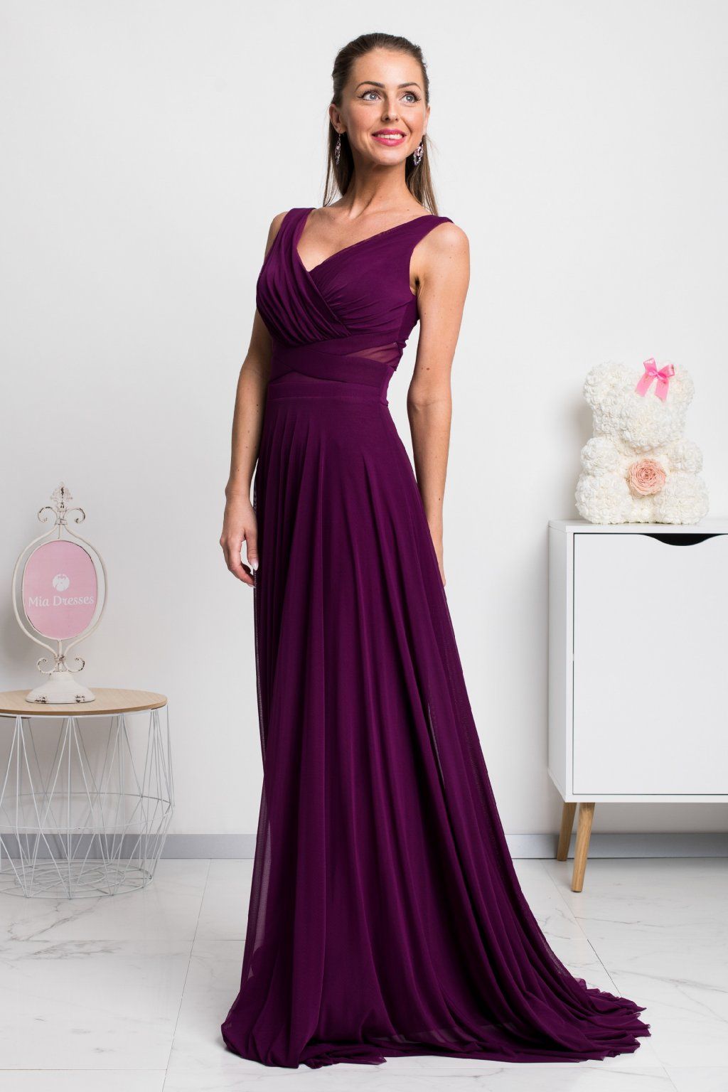 Tajuplná fialová pôsobí nežne a pre romantickú dámu sú tieto šaty ako stvorené. Decentný strih je ozvláštnený tylom, ktorý tak trošku poodhalí viac. Materiál šiat je mierne elastický, vzadu sa zapínajú zipsom a na prsiach sú vystužené.