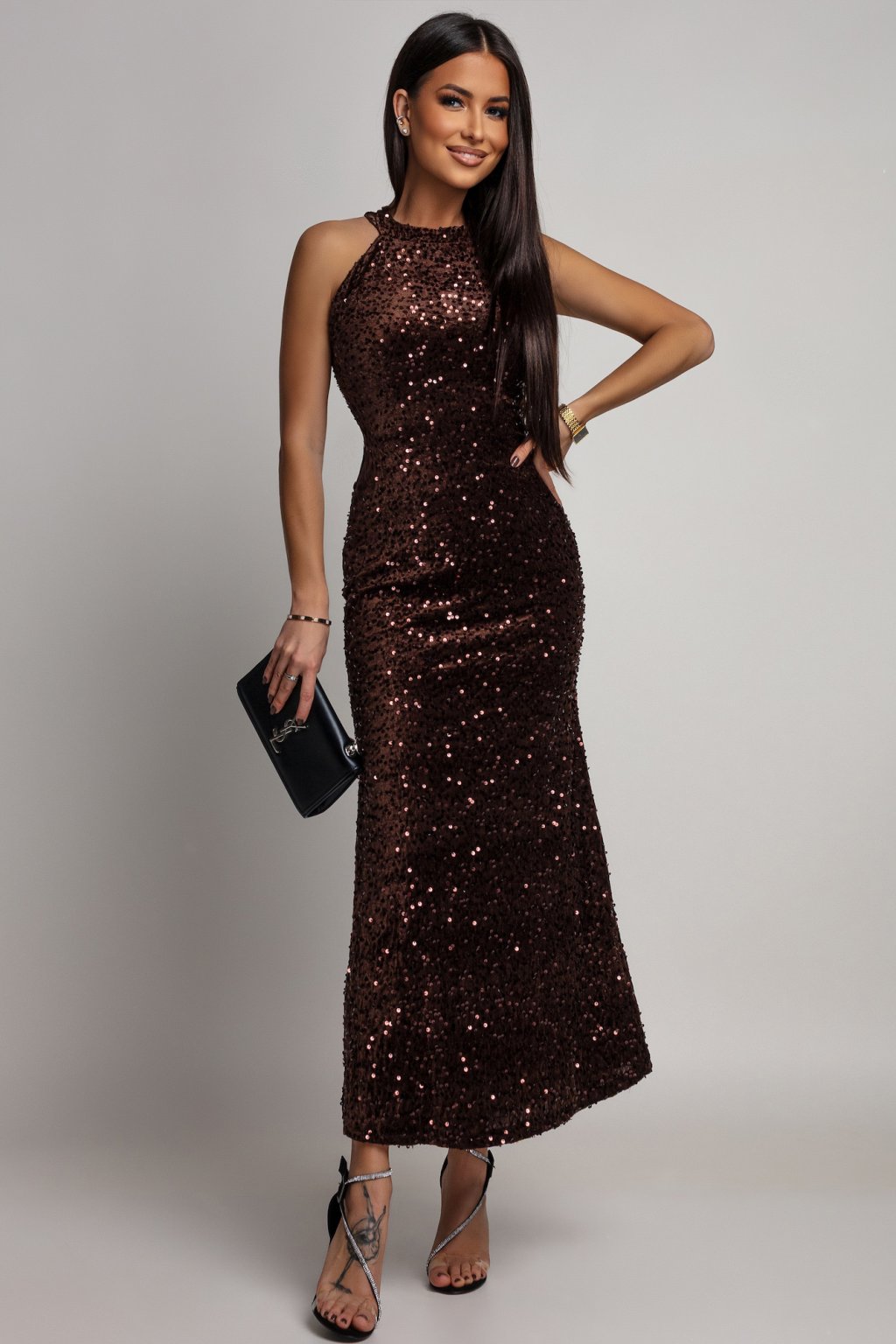 Hnedé priliehavé flitrované šaty