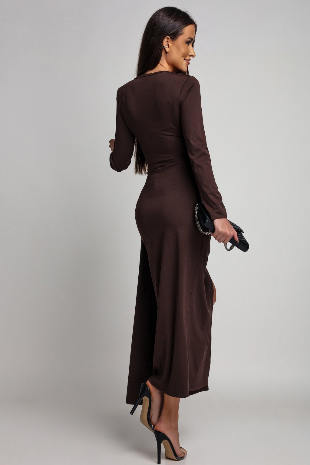 Hnedé priliehavé šaty s rozparkom