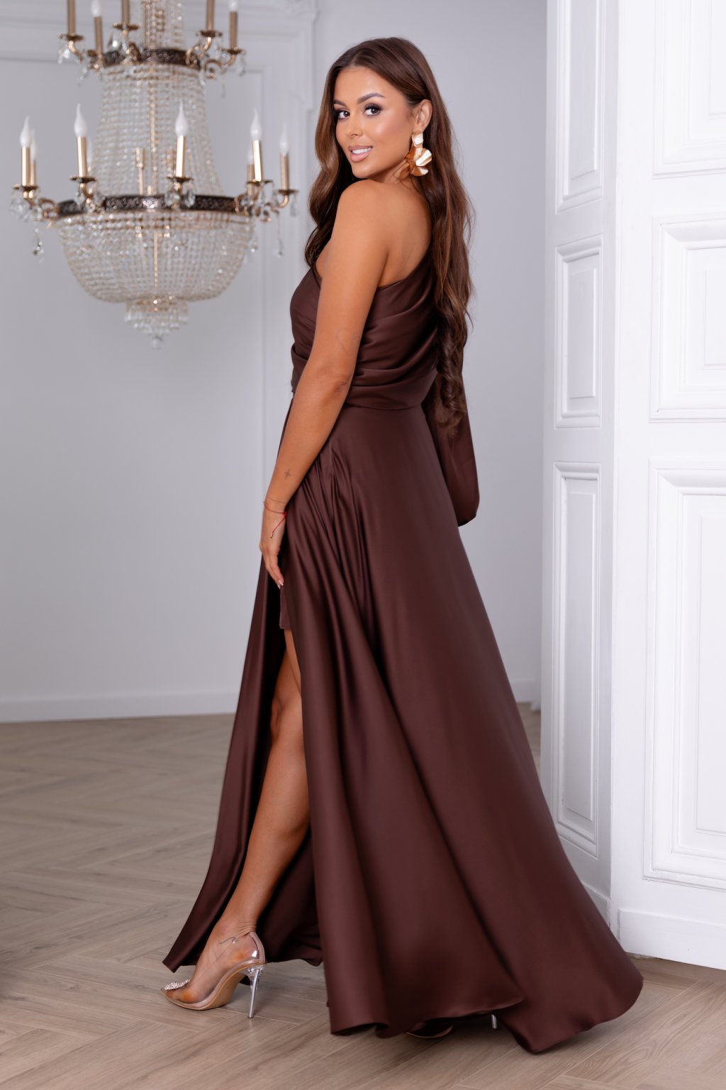 Tento model pôsobí mimoriadne žensky a sofistikovane. Asymetrický strih s jedným odhaleným ramenom dodáva šatám moderný, noblesný charakter. Sú to šaty, ktoré prirodzene pritiahnu pozornosť – elegantné, výrazné a zároveň dokonale nadčasové. Na bočnej strane sa zapínajú zipsom.