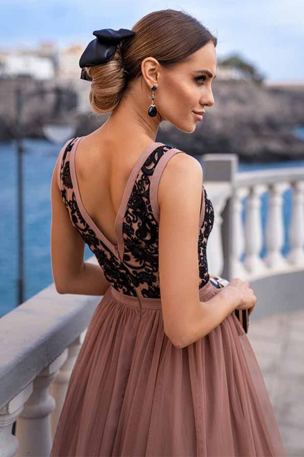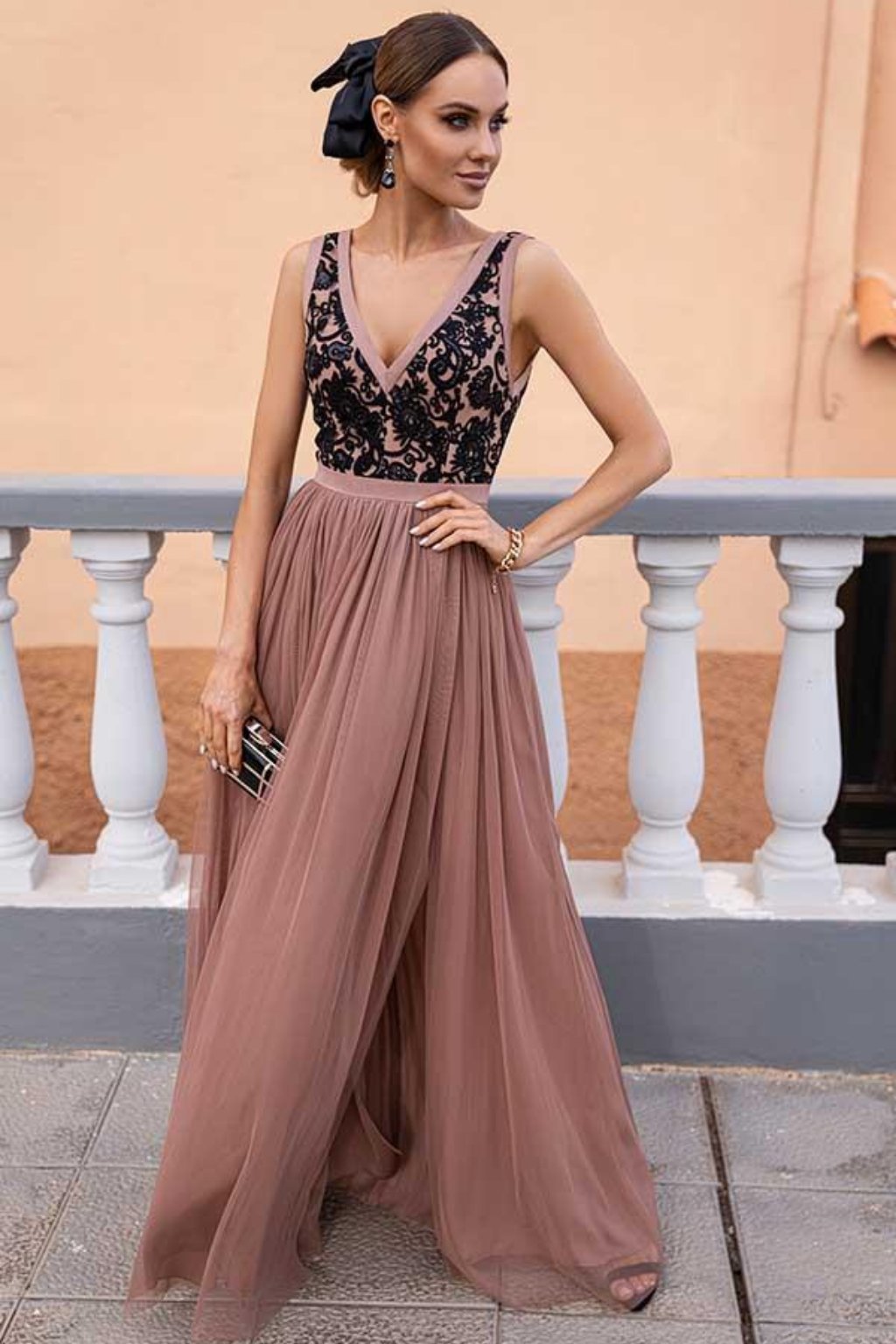 Krásne spoločenské šaty, ktoré dýchajú noblesou a eleganciou. Decentná krajka je vkusnou ozdobou šiat a tylová sukňa s rozparkom sa postará o sexi krok. Materiál šiat nie je elastický a vzadu sa zapínajú zipsom.