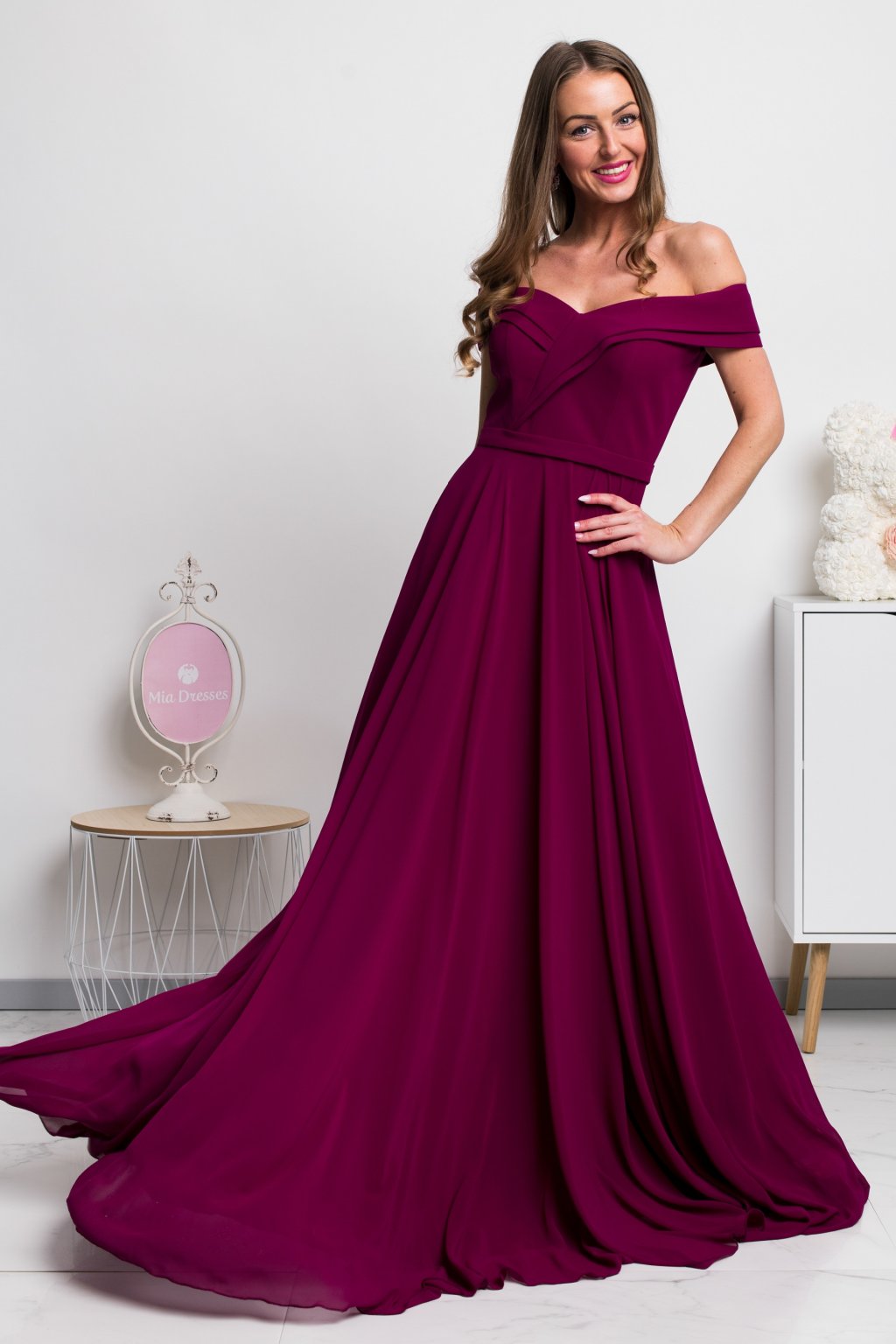 V týchto šatách vstúpi do miestnosti elegantná dáma s veľkou dávkou sofistikovanosti a šarmu. Odhalené ramená zlákajú všetky pohľady a neprehliadnuteľná purpurová farba na parkete zažiari. Materiál nie je elastický, vzadu sa šaty zapínajú zipsom a na prsiach sú vystužené.