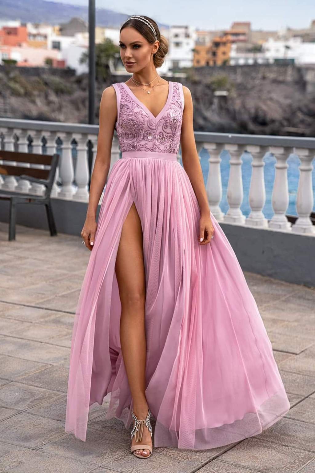 Krásne spoločenské šaty, ktoré dýchajú noblesou a eleganciou. Decentná krajka je vkusnou ozdobou šiat a tylová sukňa s rozparkom sa postará o sexi krok. Materiál šiat nie je elastický a vzadu sa zapínajú zipsom.