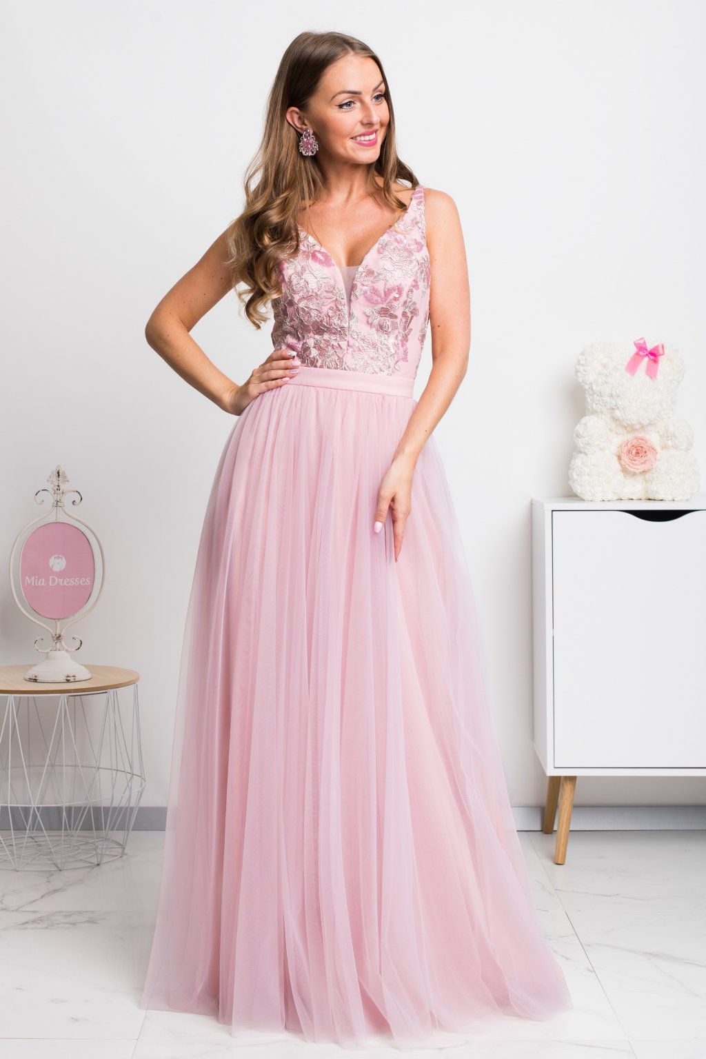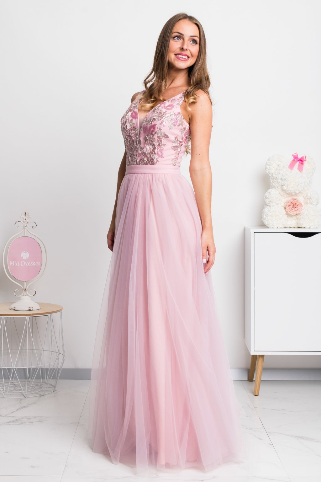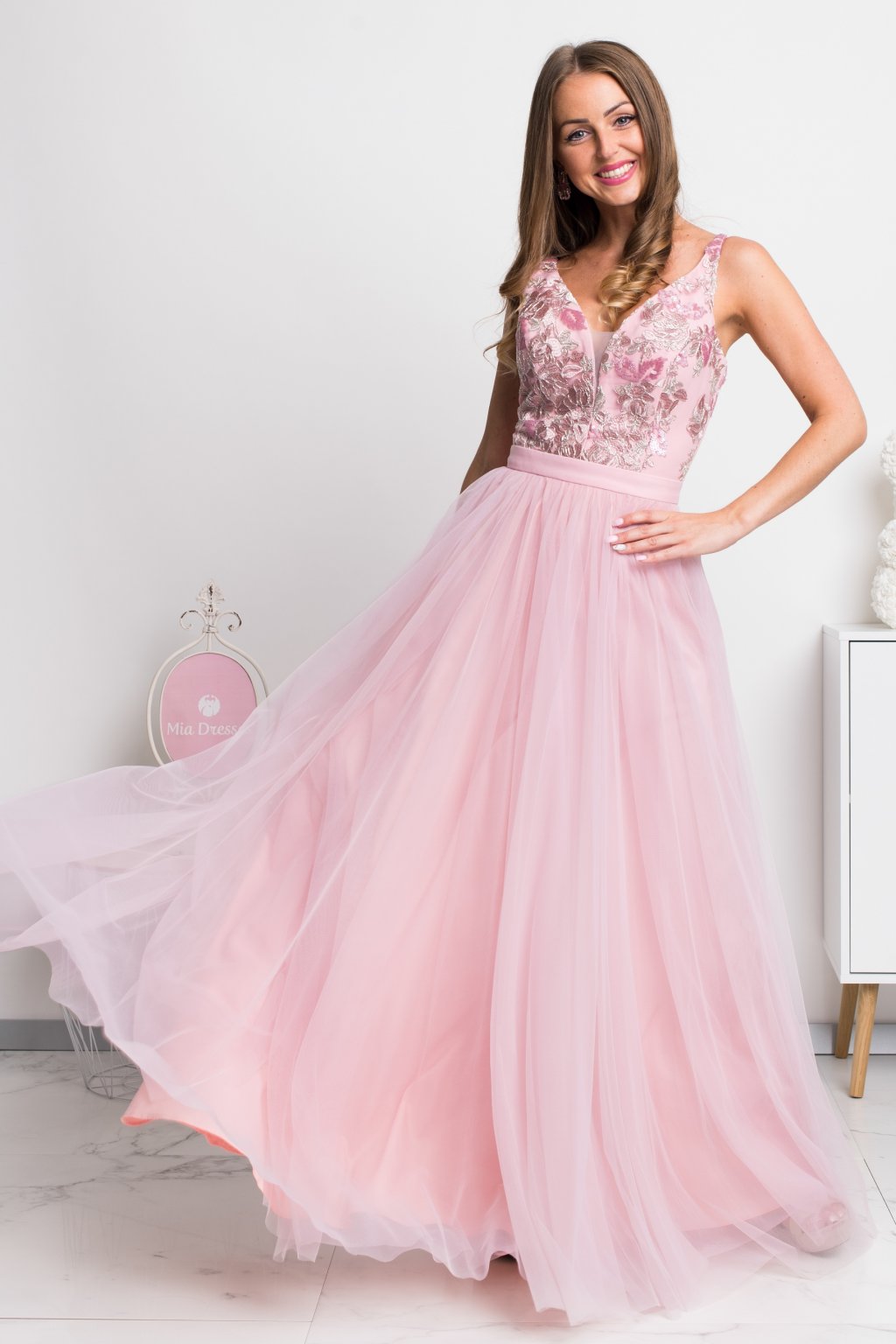 Ružové spoločenské šaty so striebornou krajkou