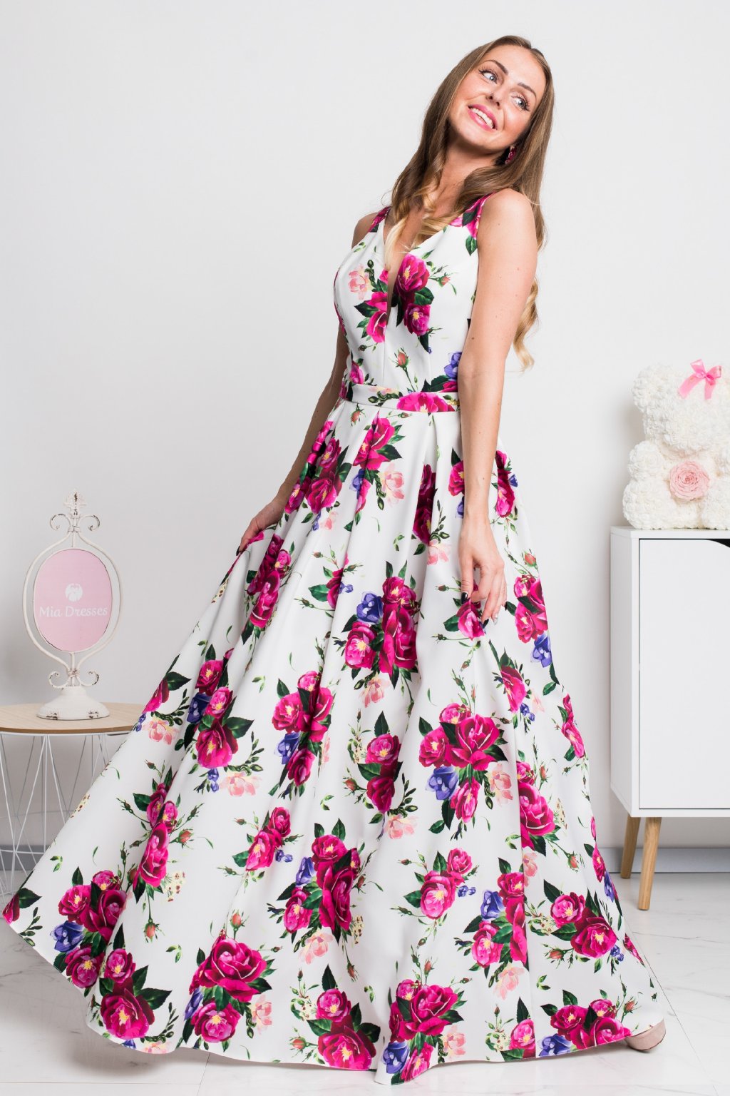 Čaká vás spoločenská udalosť? Siahnite po týchto krásnych šatách so žiarivými ružami, ktoré podčiarknu vašu osobnosť. Strih týchto šiat je navyše lichotivý pre všetky typy postavy. Nadýchaná sukňa si krásne drží tvar vďaka spodničke, na ktorej je našitý tyl. Vzadu sa šaty zapínajú zipsom a ramienka sú nastaviteľné.