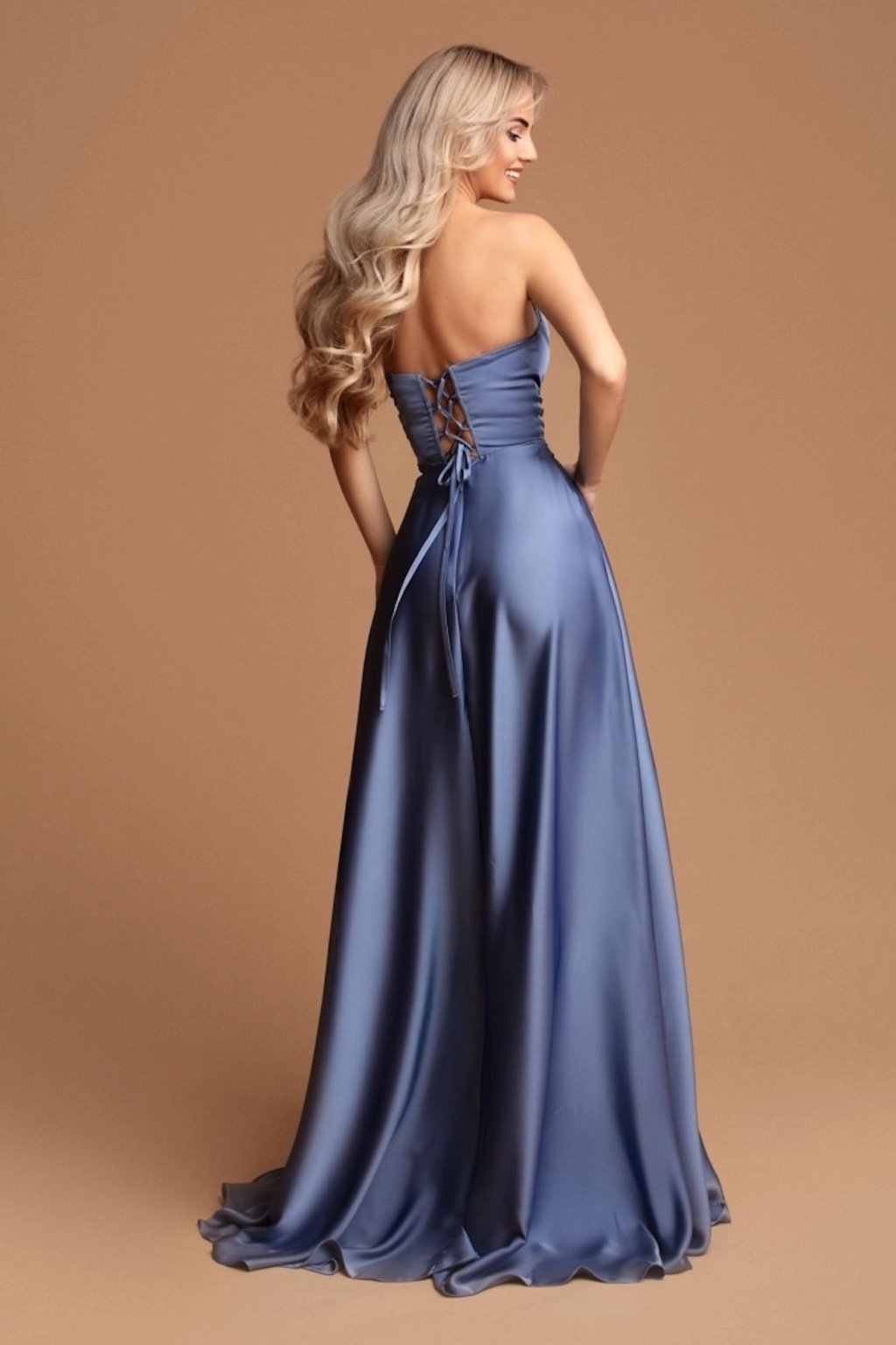 Satén je zárukou podmanivého vzhľadu s veľkou dávkou elegancie a noblesy a tieto saténové šaty nie sú výnimkou. K dokonalému vzhľadu prispeje rozparok a decentné kamienky, ktoré zdobia dekolt. Šaty sú na prsiach vystužené, na chrbte majú šnurovanie a na sukni sa zapínajú zipsom. Súčasťou šiat sú odnímateľné ramienka.