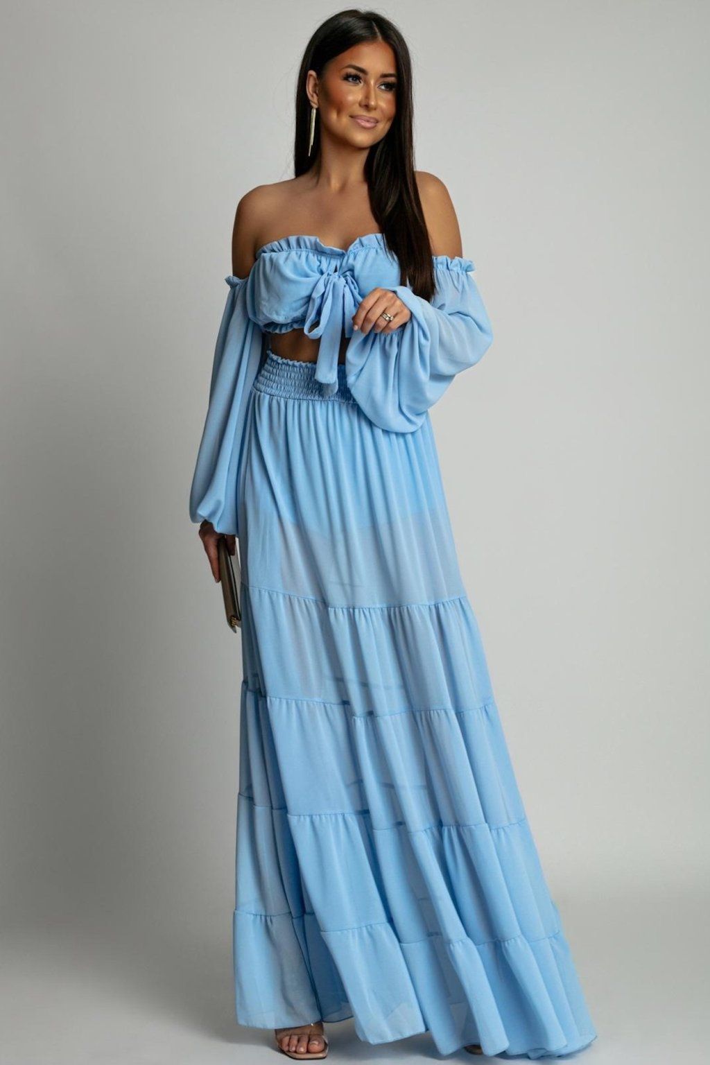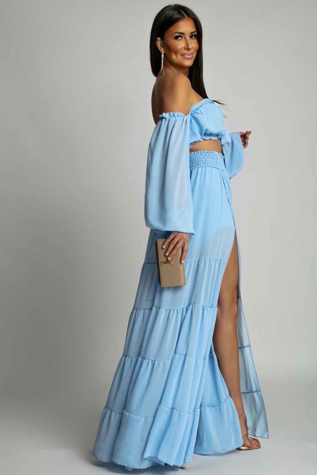Vzdušný komplet, ktorý si zamilujete počas letných dní. Voľná dlhá sukňa v kombinácii s krátkym topom vytvára harmonický a veľmi ženský look, ktorý pôsobí ľahko, sviežo a romanticky. Tento model je ako stvorený pre dámy, ktoré milujú pohodlie, no zároveň chcú zostať elegantné a štýlové. Materiál kompletu je elastický.