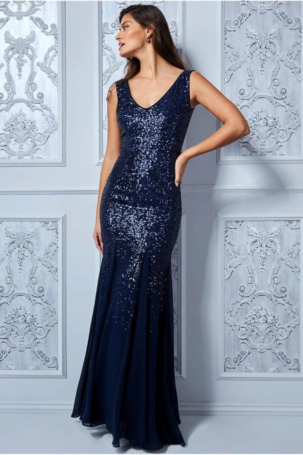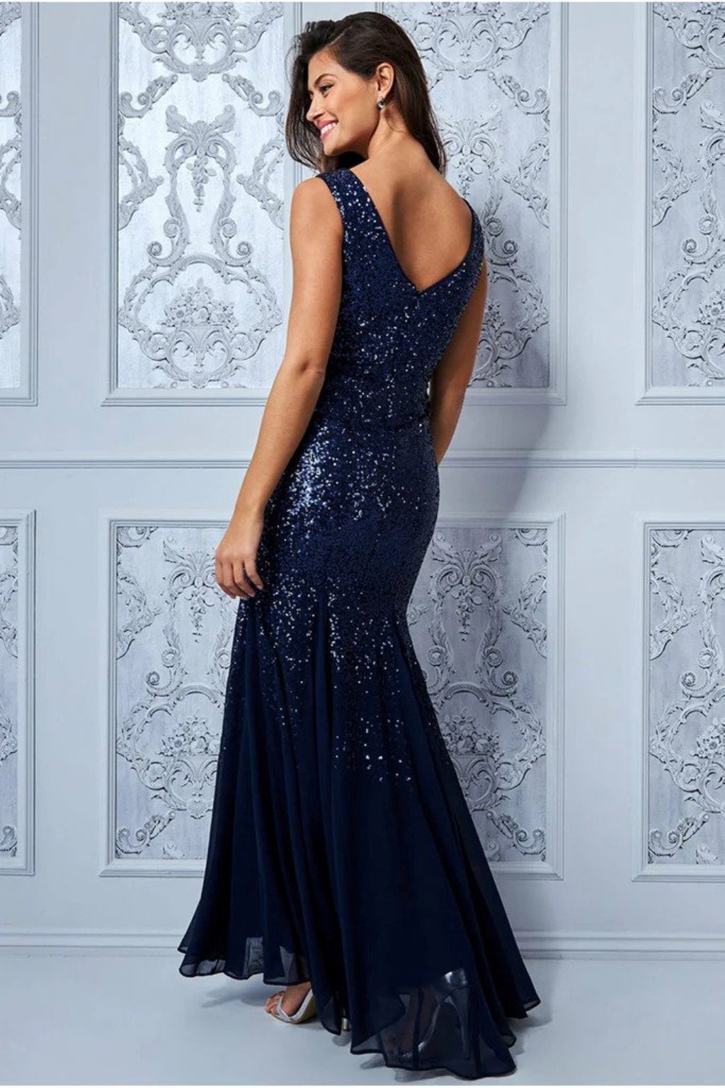 Tieto šifónové šaty majú jednoduchý, no zároveň pôvabný strih. Sú husto posiate flitrami, ktoré v spodnej časti ubúdajú do stratena. Spodná časť je jemne rozšírená a nariasená, čo je zárukou noblesy a šarmu. Vzadu majú zapínanie na zips.