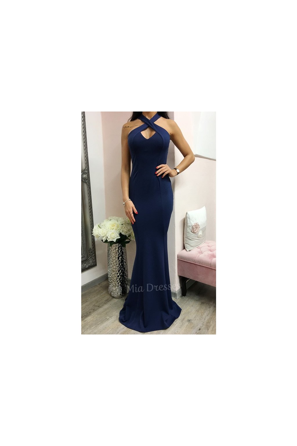 Tmavomodré spoločenské šaty s prekríženými ramienkami