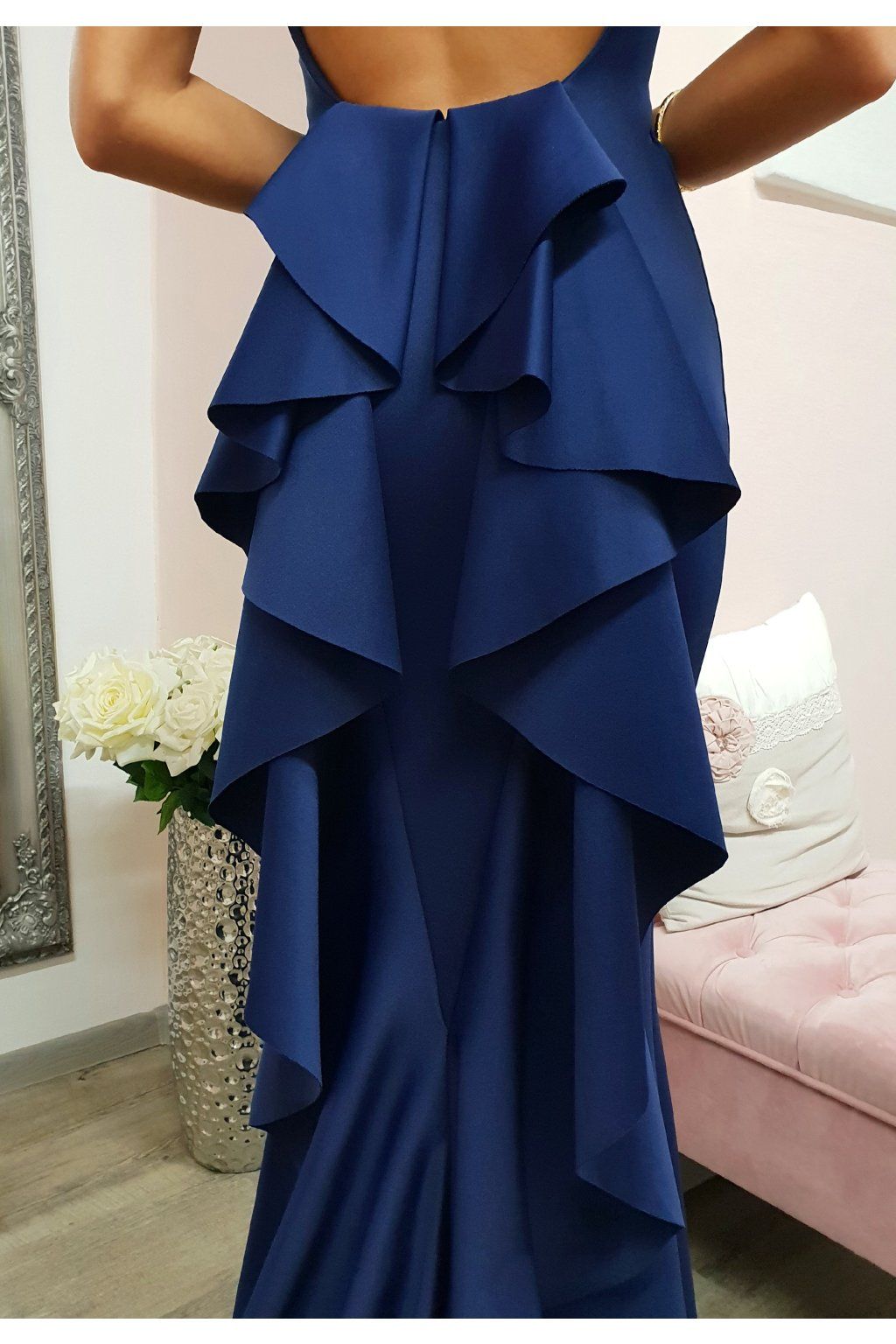 Tmavomodré spoločenské šaty s volánom