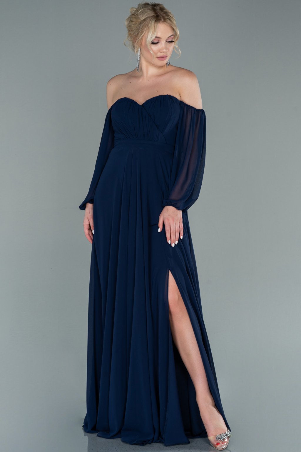 Tmavomodré spoločenské šaty spustené na ramená