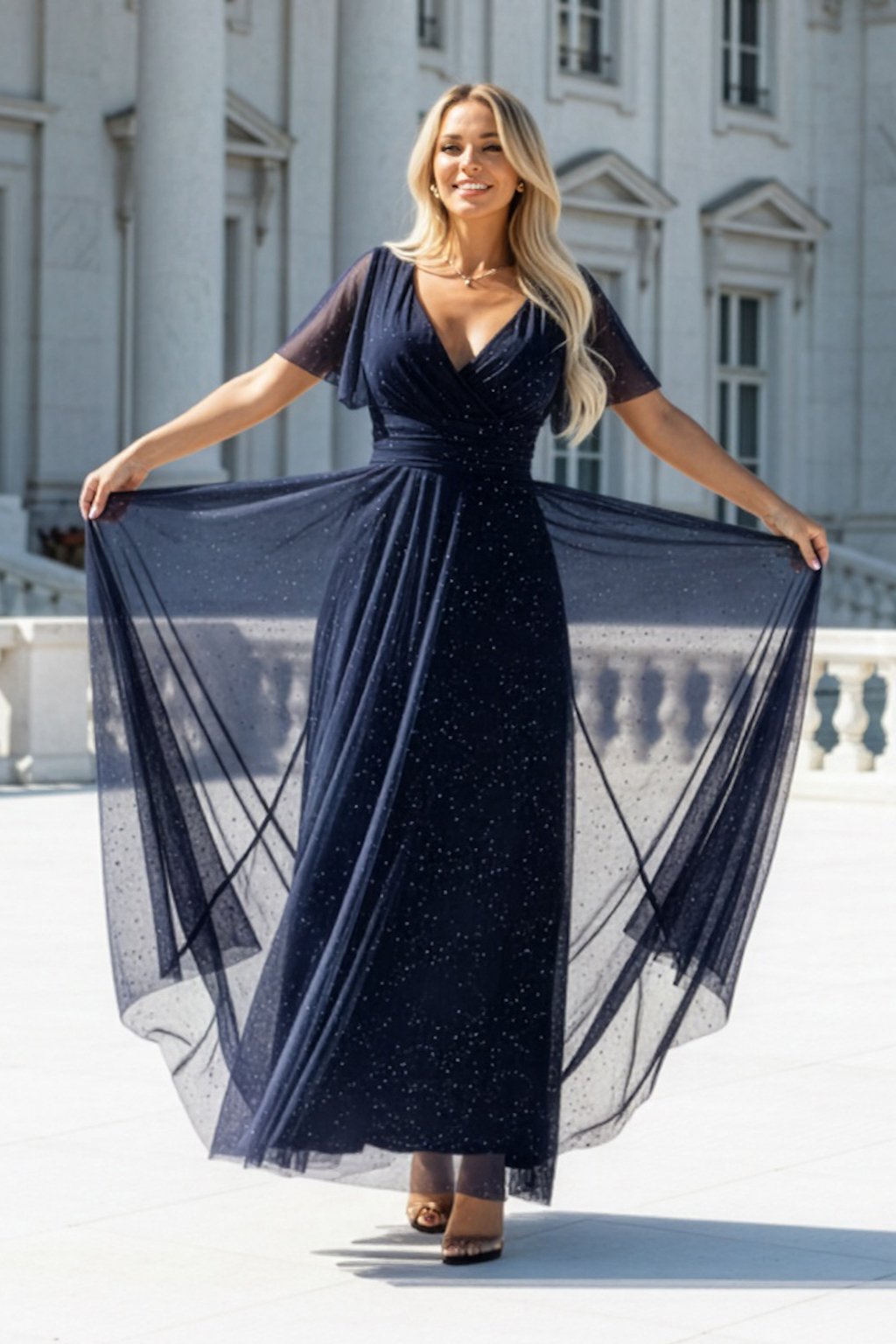 Tmavomodré tylové šaty s trblietkami