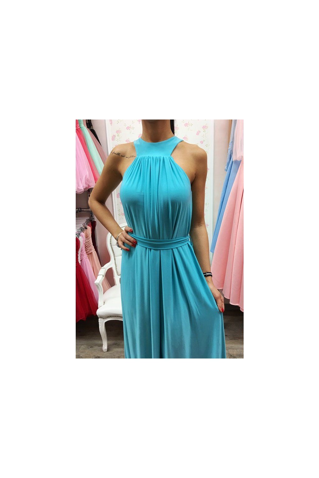 Tyrkysové dlhé šaty z jemne lesklého elastického materiálu sú vzadu na viazanie, čo im dodáva originalitu. Sú vhodné na letné spoločenské a slávnostné udalosti.