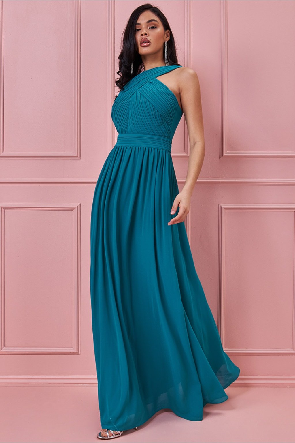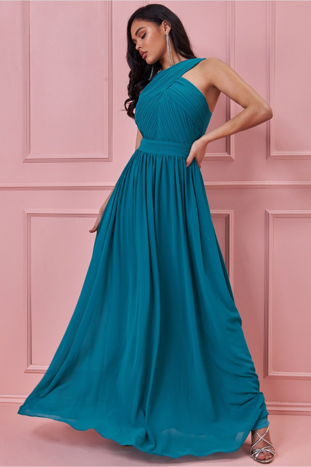 Tyrkysové šifónové šaty s odhaleným chrbtom