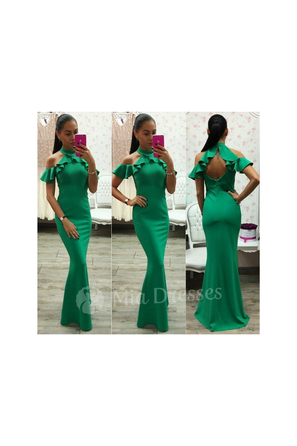 Zelené spoločenské šaty s volánom