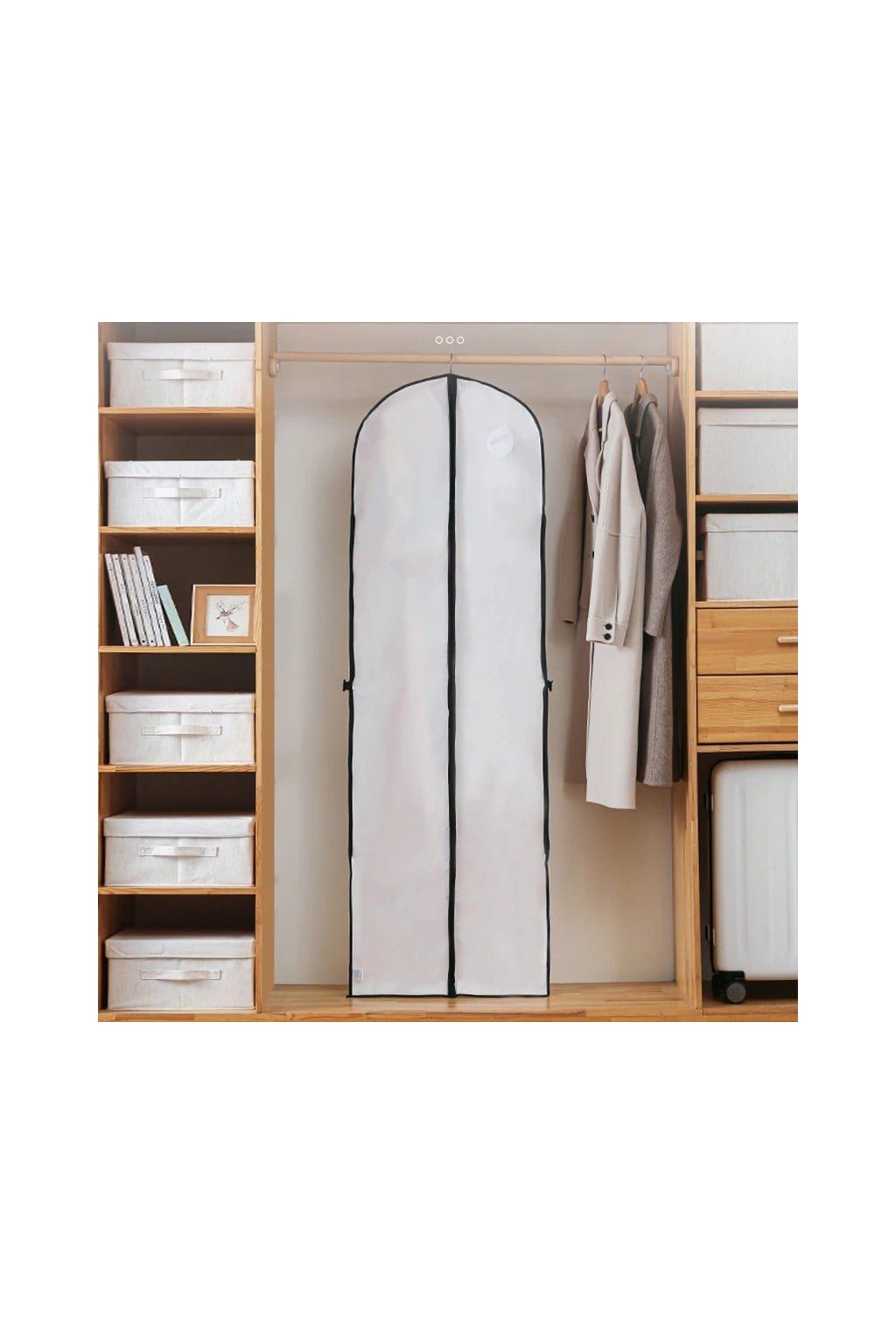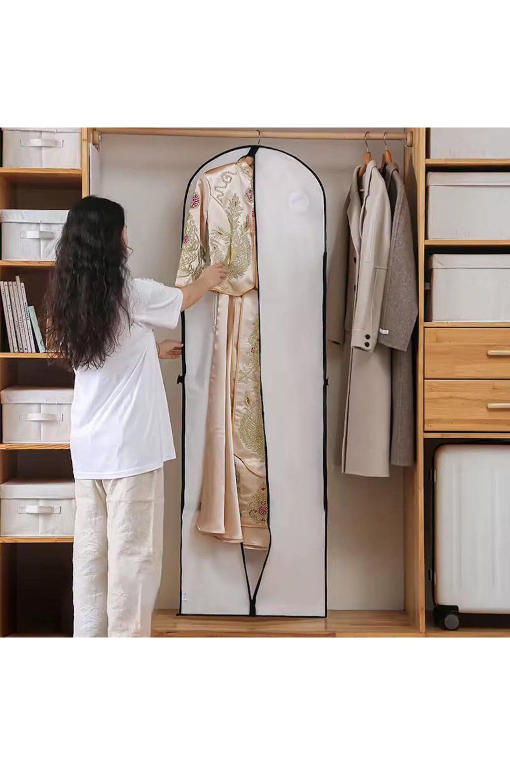 Pomáha chrániť šaty pred prachom, jemným znečistením a vlhkosťou počas skladovania alebo transportu.