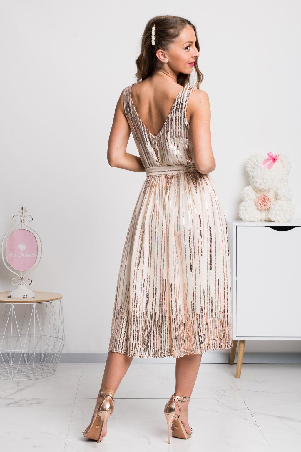 Béžové spoločenské midi šaty s flitrami