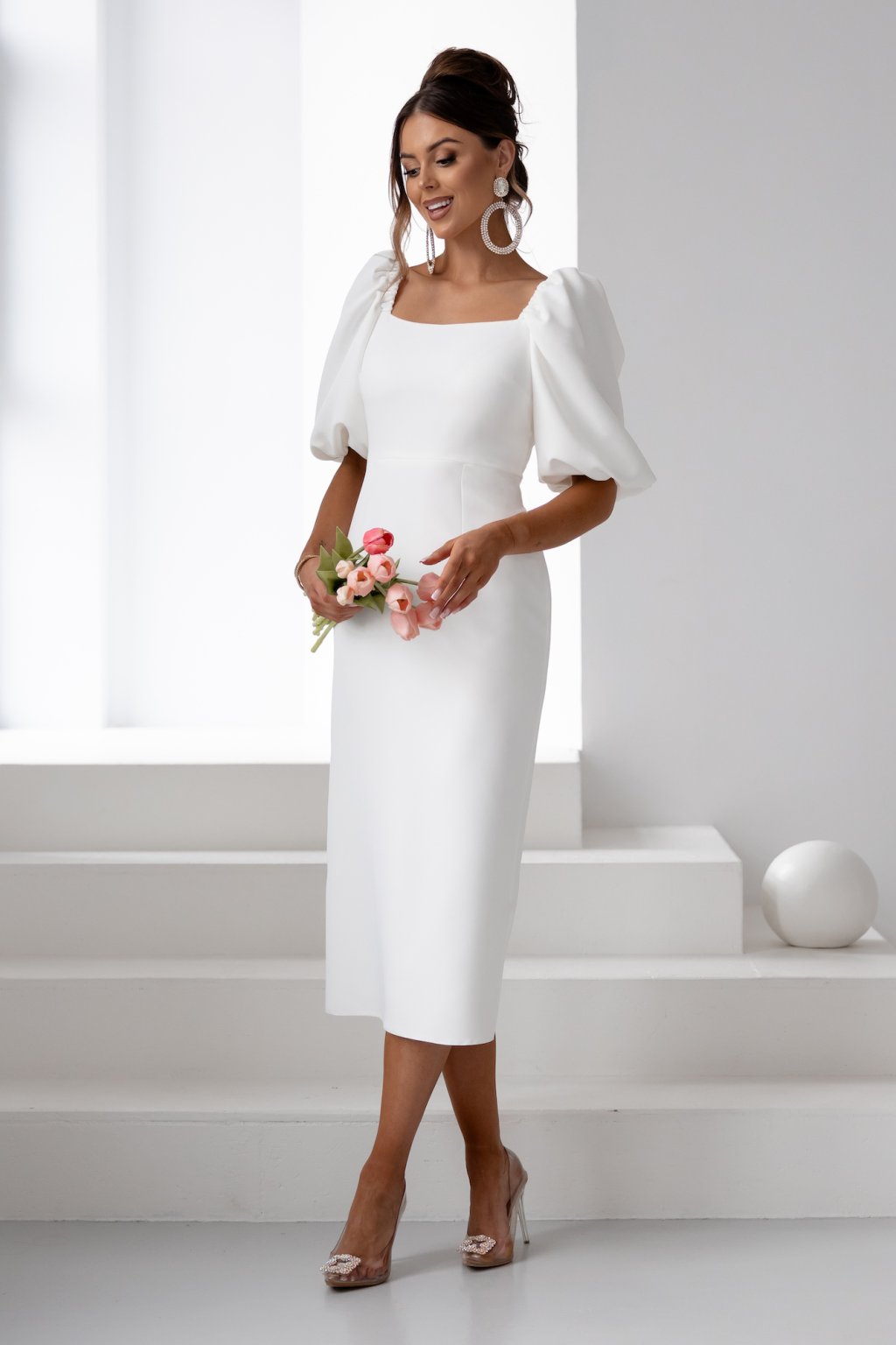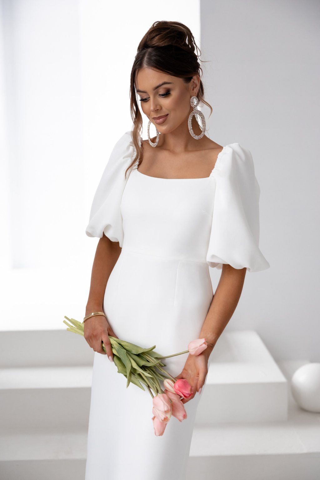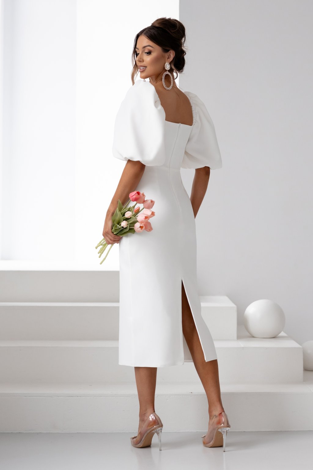 Tieto midi šaty s priliehavým strihom a nadýchanými balónovými rukávmi v sebe spájajú ženskosť, štýl a nádych romantiky. Na svadbe, oslave či večierku v nich zažiarite ako elegantná dáma s noblesou a šarmom, ktorá upúta pozornosť s prirodzenou gráciou. Vzadu sa zapínajú zipsom.