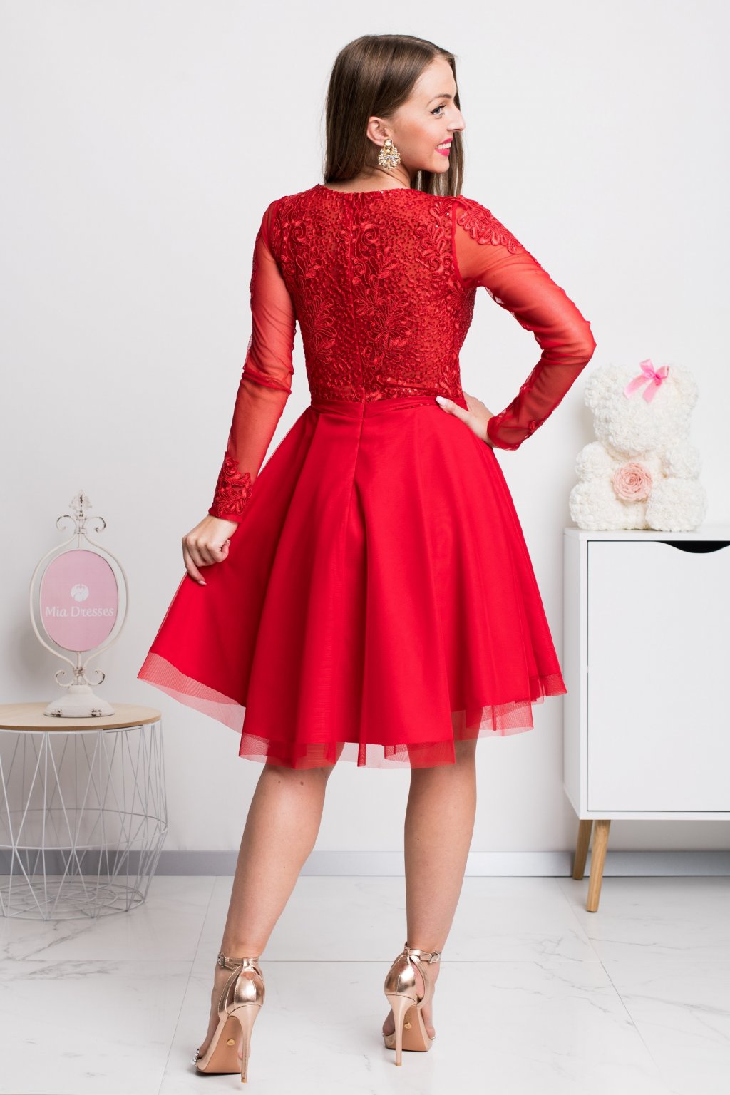 Červené krátke šaty s tylovou sukňou a rukávmi
