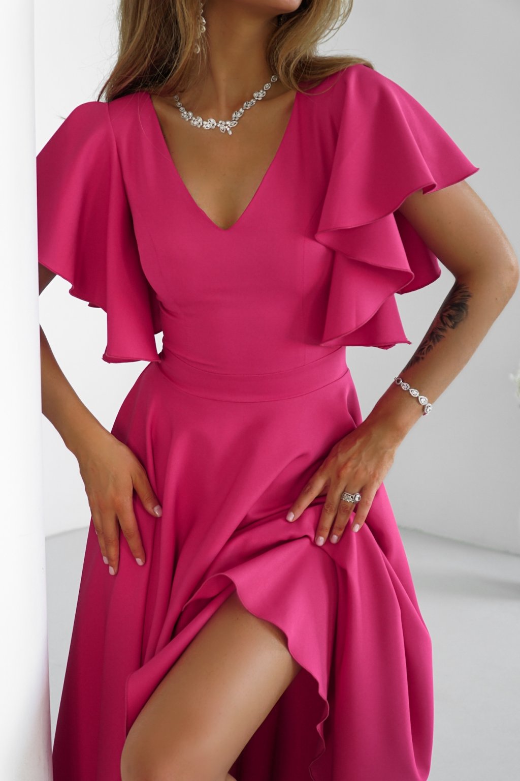 Cyklámenové midi šaty s volánovými rukávmi
