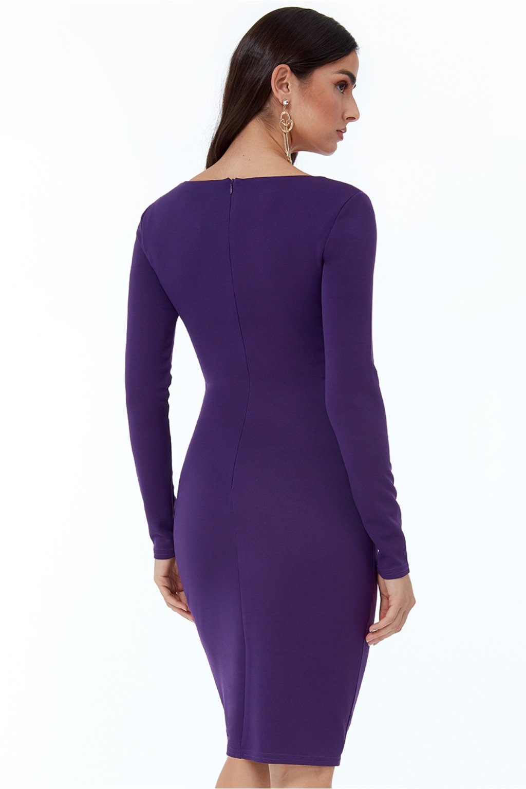 Šaty s nádychom elegancie a pôvabu sú v pútavej fialovej farbe, vďaka dlhým rukávom ideálne do týchto chladných dní. Tieto šaty v midi dĺžke sú zaujímavé svojim netradičným výstrihom a jemným nariasením v oblasti pása. Materiál je elastický, priliehavý a vzadu sa zapínajú na zips.
