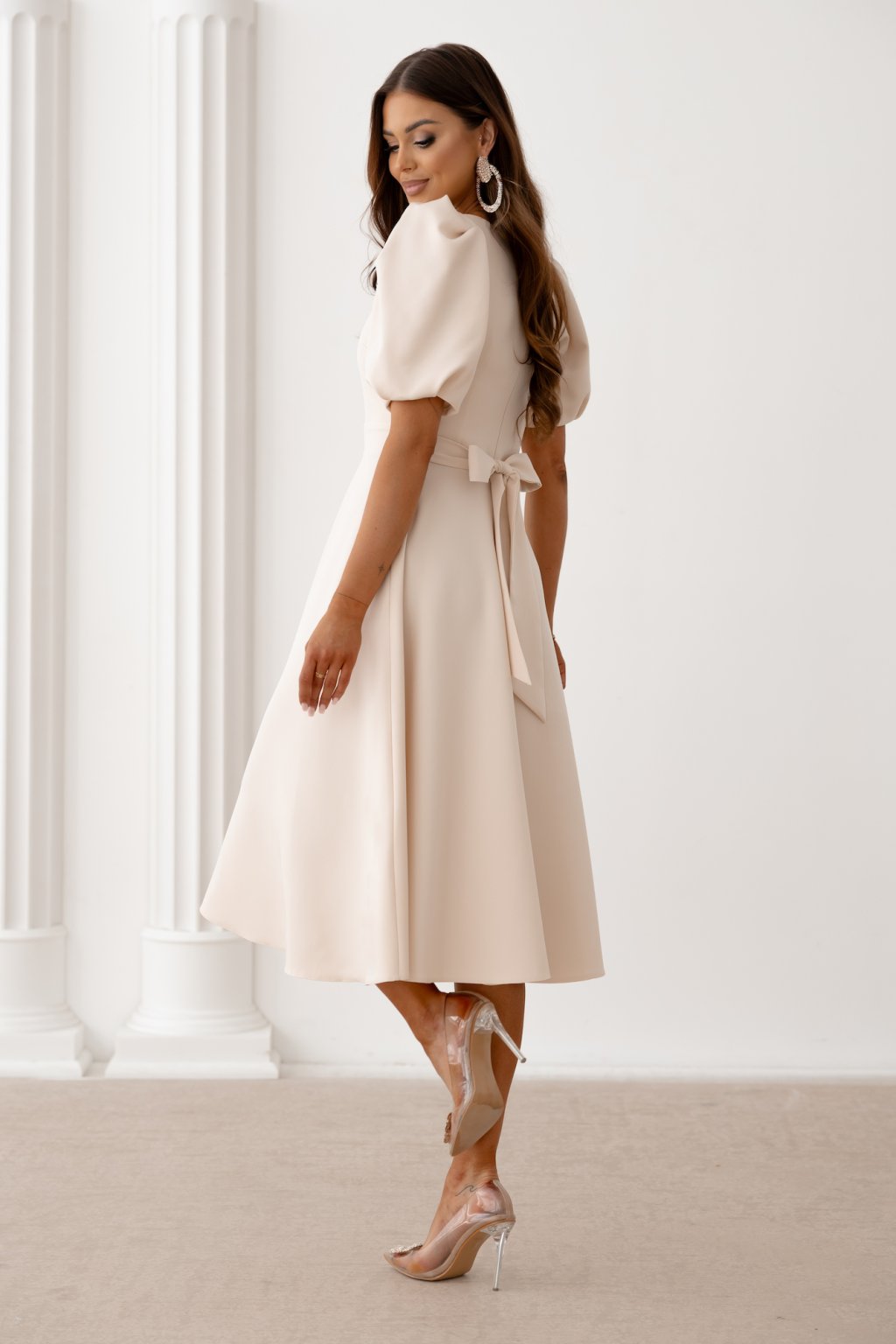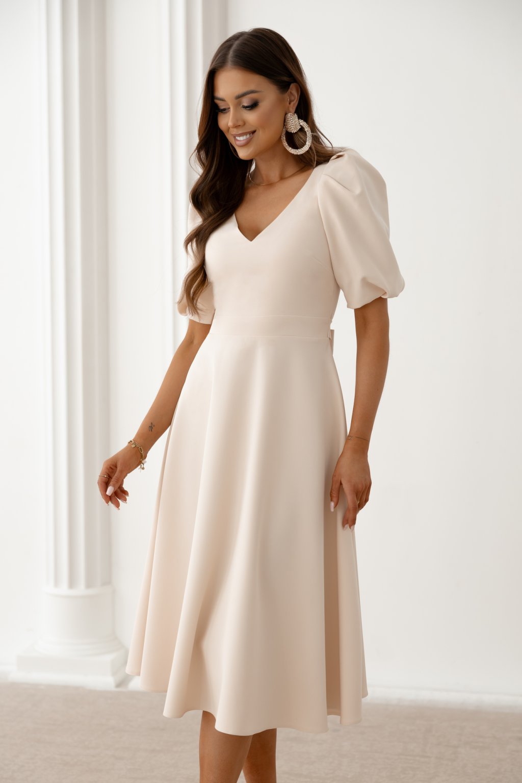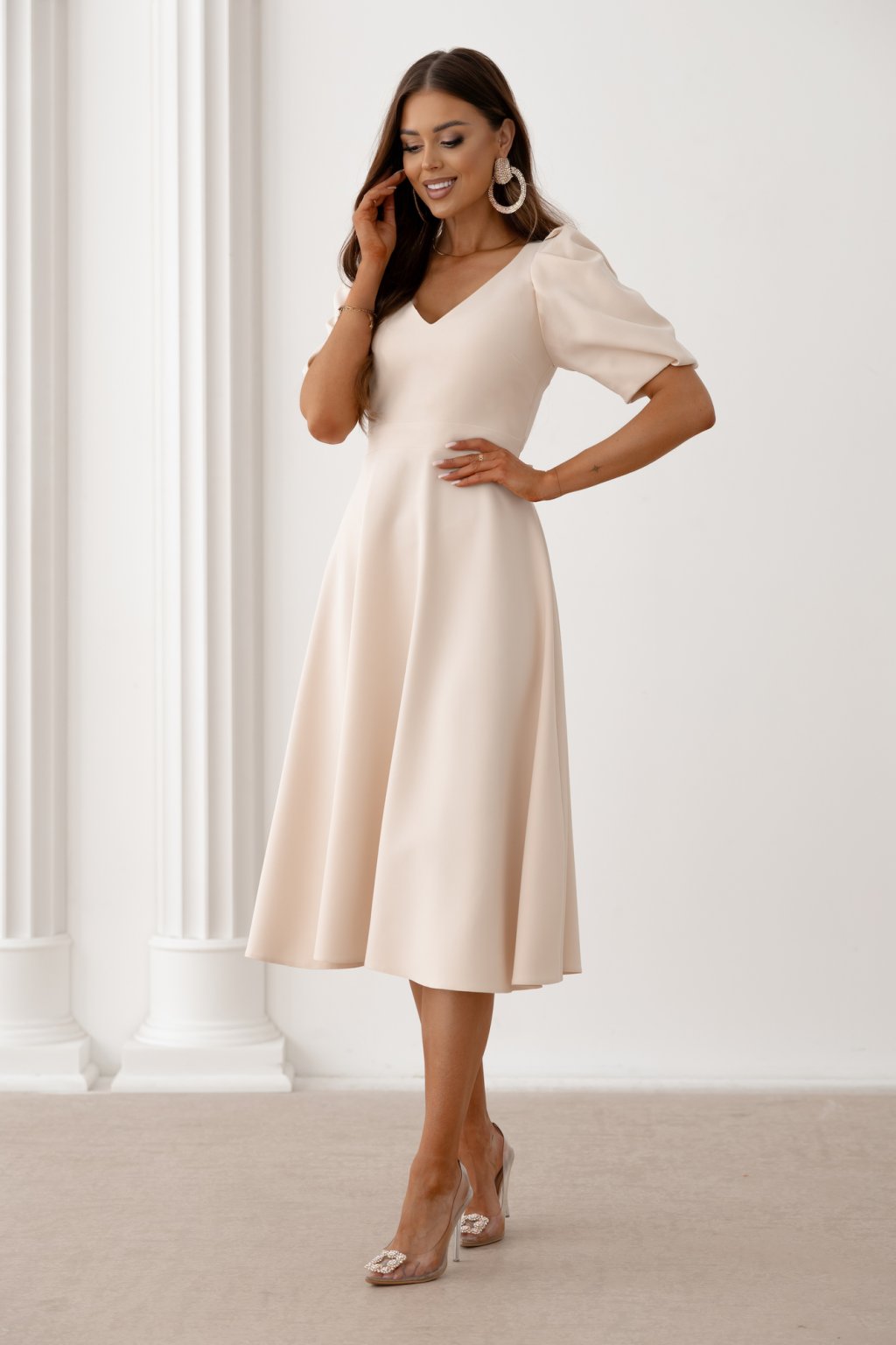 Krémové midi šaty s balónovými rukávmi