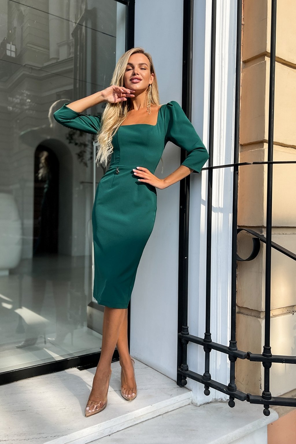 Smaragdové midi šaty s odhaleným chrbtom