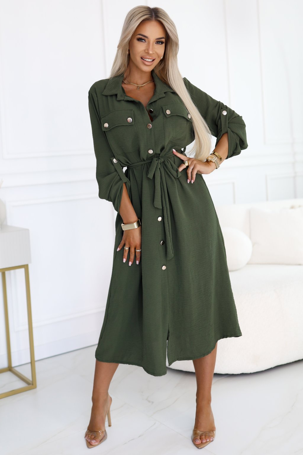 Tieto elegantné šaty sa stanú vašim príjemným spoločníkom vďaka ľahkému materiálu a pohodlnému strihu. V páse sa uväzujú opaskom.
