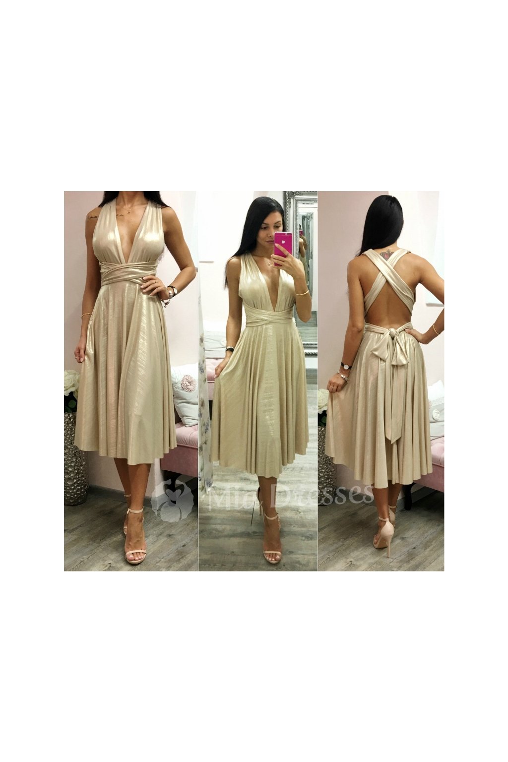 Midi šaty so zlatistým nádychom a jemným leskom vám zaručia okúzľujúci vzhľad. Vrchná časť šiat je na viazanie. So štipkou nápaditosti si môžete tento model uviazať viacerými spôsobmi. V zadnej časti je v páse všitá gumička.