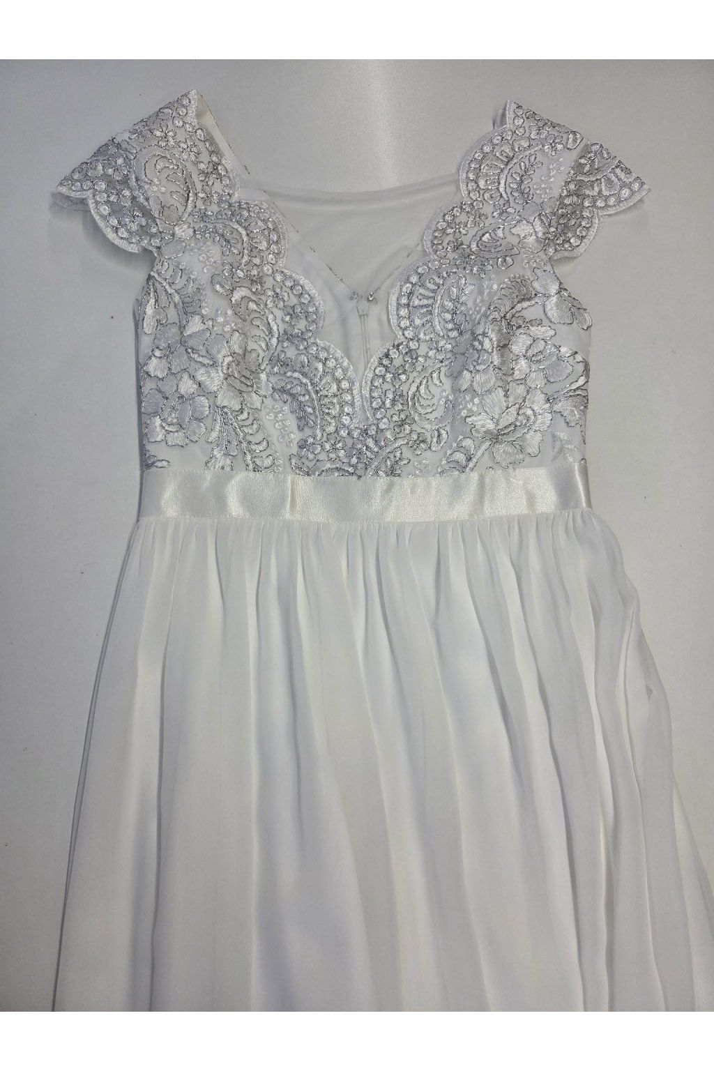 Kombinácia šifónu a vyšívaných kvietkov je neodolateľnou súčasťou týchto nádherných spoločenských šiat. Suknička je krásne padavá. Vrchná časť šiat má väčší výstrih, ale akákoľvek nehoda je priam nemožná, keďže je vyplnený tylom. Šaty sa vzadu zapínajú zipsom.