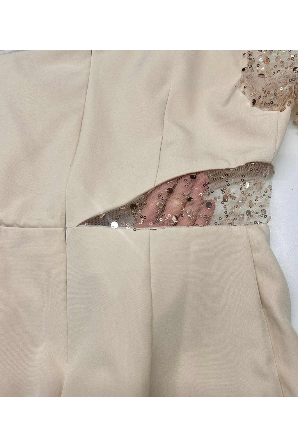 Poškodený tovar - Béžové priliehavé šaty s trblietavým rukávom