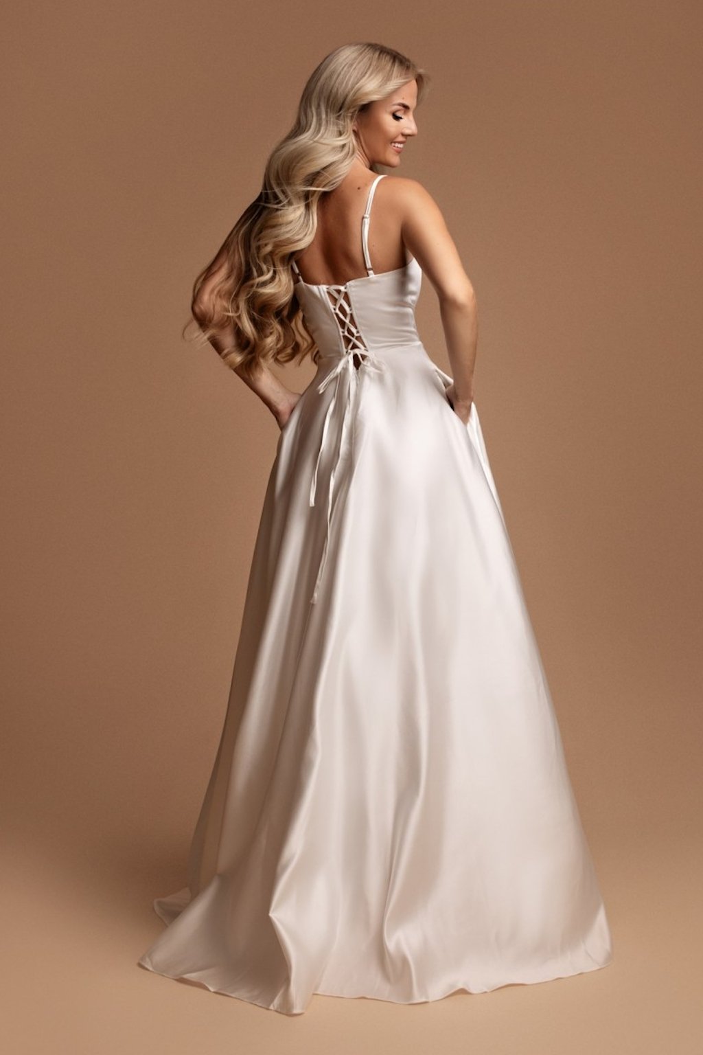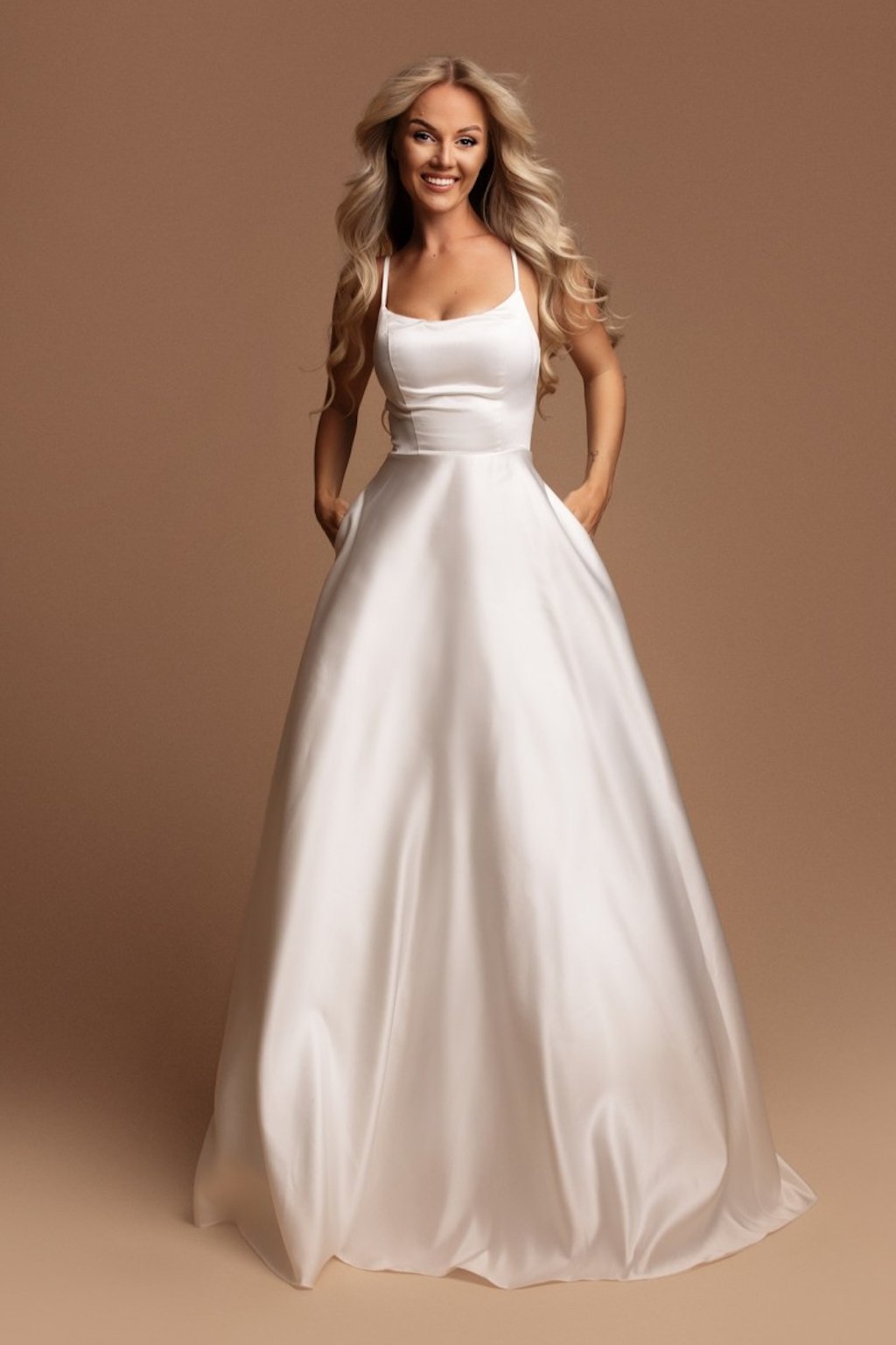 Nadýchaná sukňa a krásny lesklý materiál, to je jednoducho noblesná kombinácia, v ktorej pred oltárom zaiste zažiarite. Šaty sú na prsiach vystužené, na sukni pod šnurovaním sa zapínajú zipsom a ramienka majú nastaviteľné.