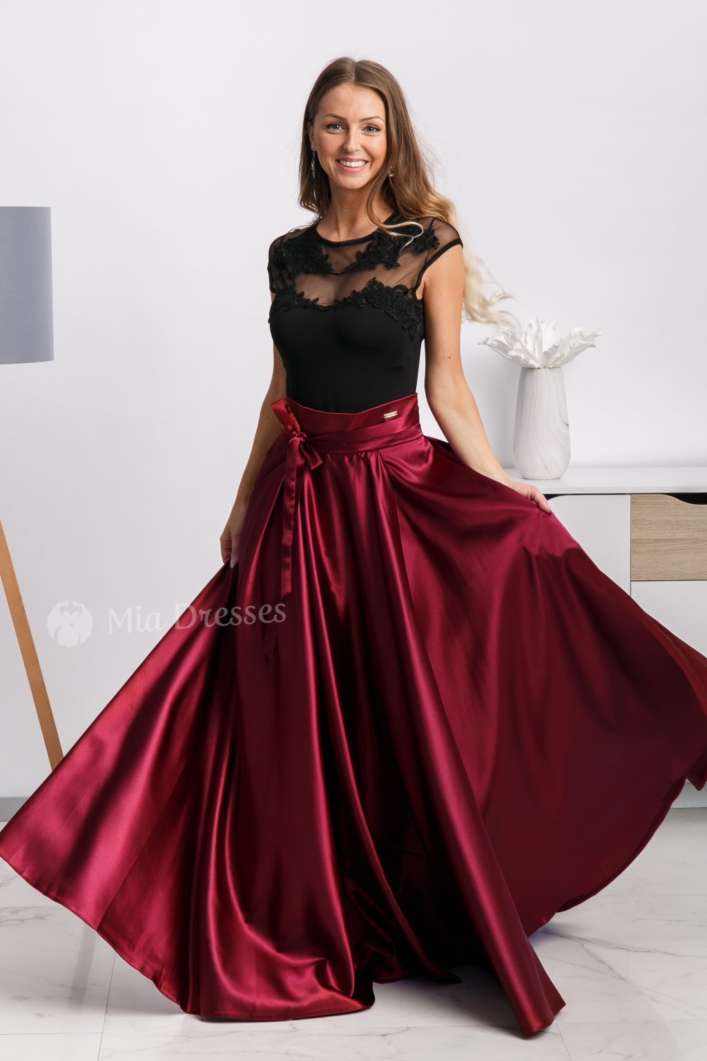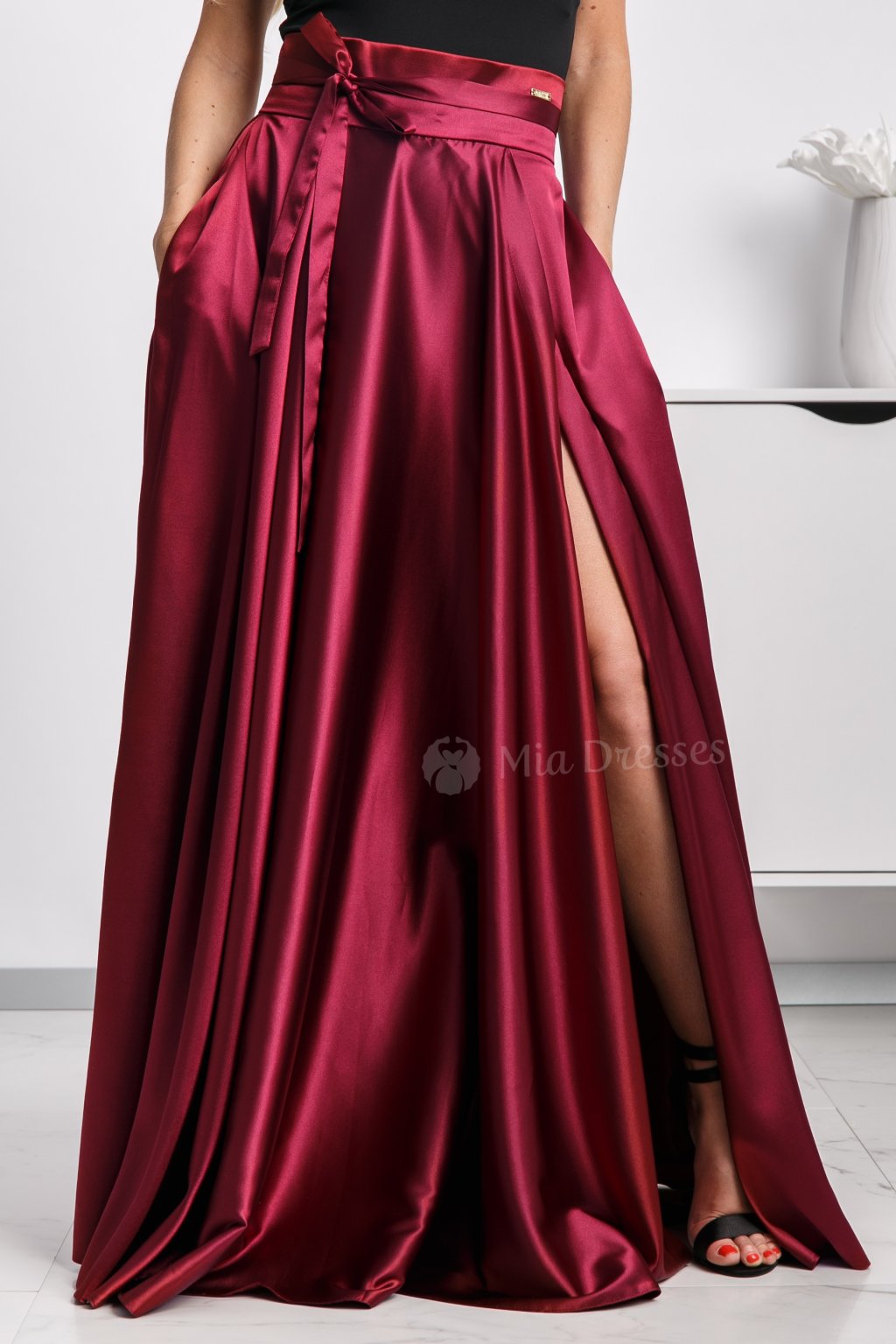 Luxusný outfit a pocit jedinečnosti vám zaručí táto bordová sukňa. Tenký ľahučký satén vás pohladí na koži (aj na duši, keď sa uvidíte v sukničke v zrkadle). Stuha v páse, rozparok a vrecká sú už len sladkou bodkou na záver.