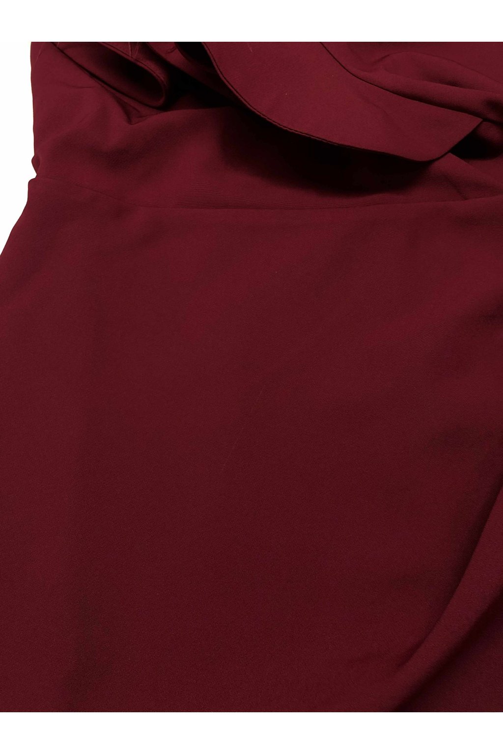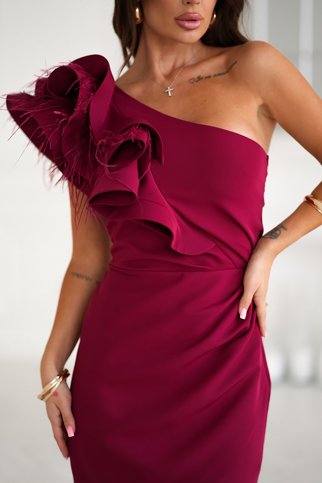 Mohutný volán lemujúci rameno na seba strhne každý pohľad a vy budete elegantná, sexi a neprehliadnuteľná. Materiál šiat je mierne elastický a vzadu sa zapínajú zipsom.