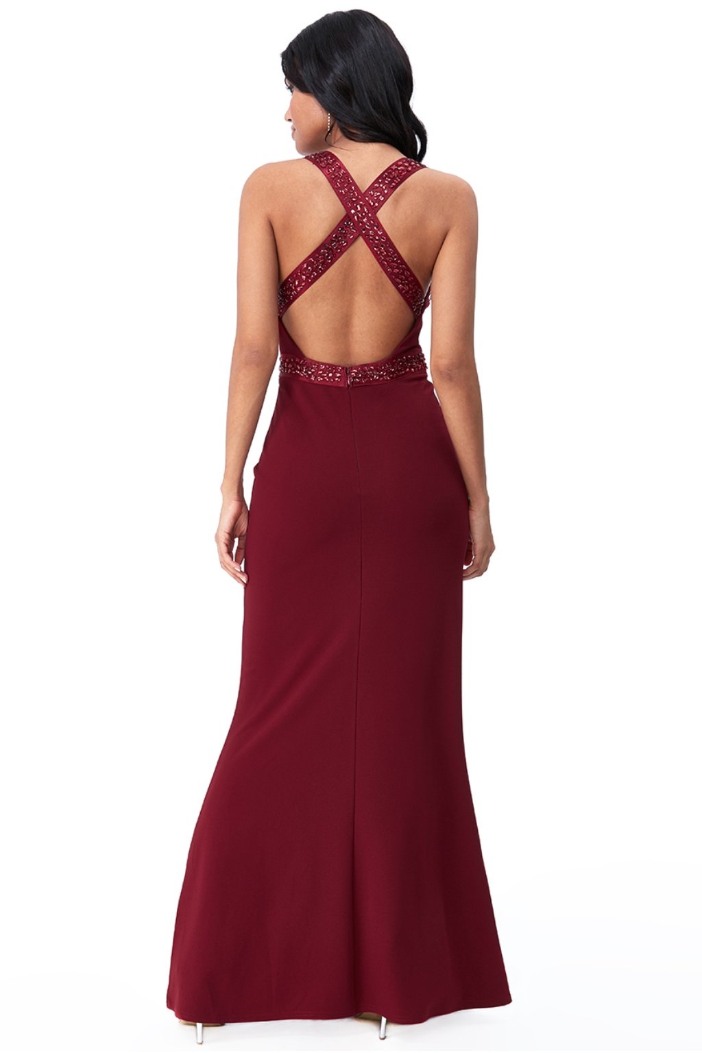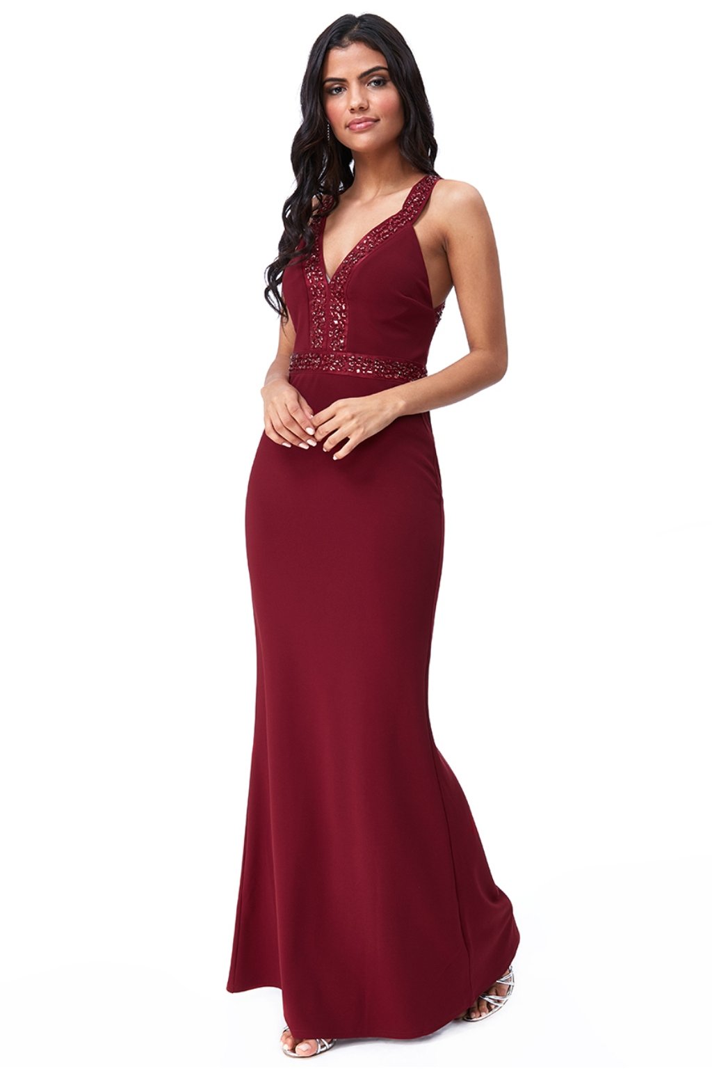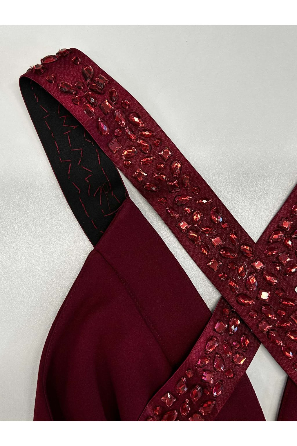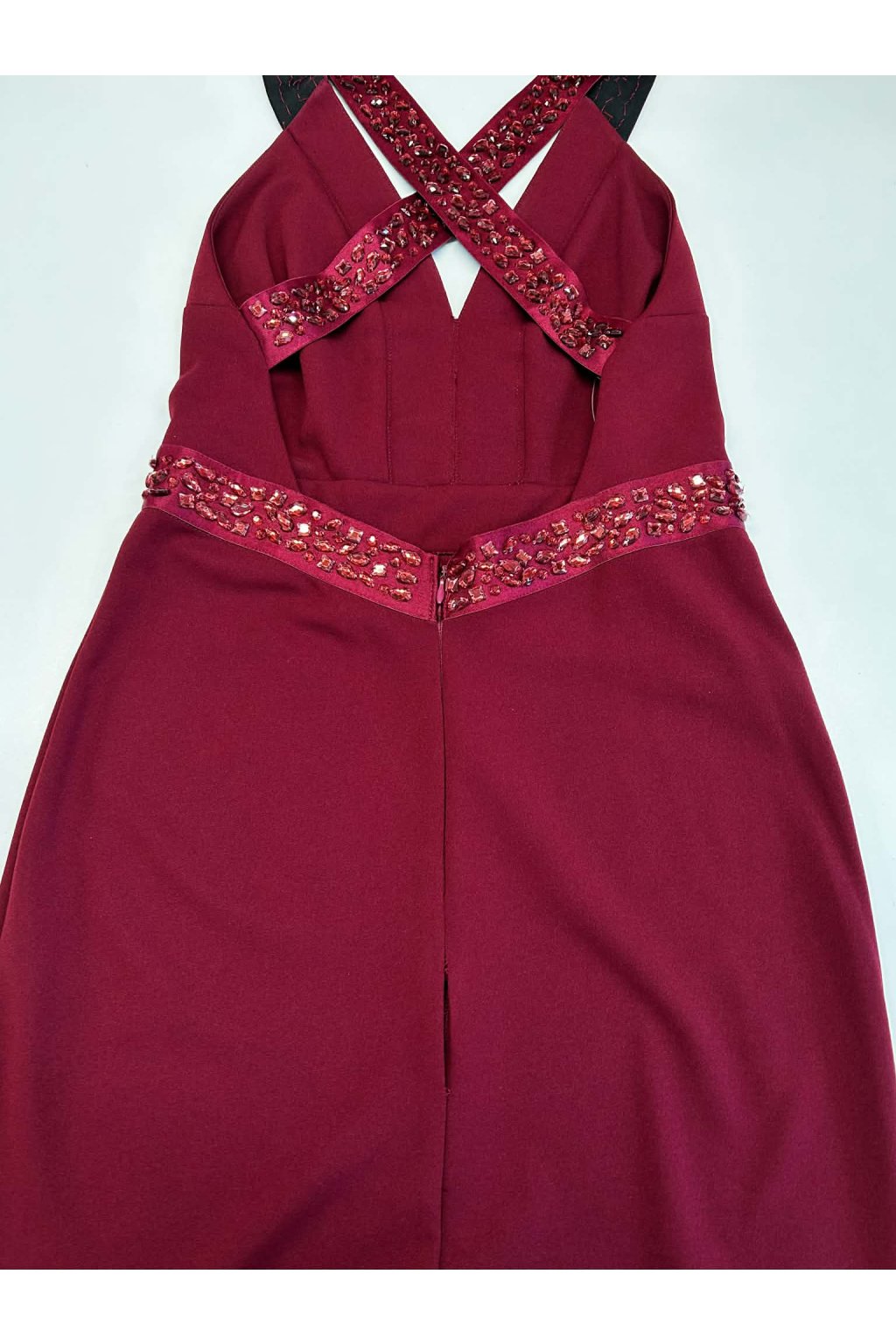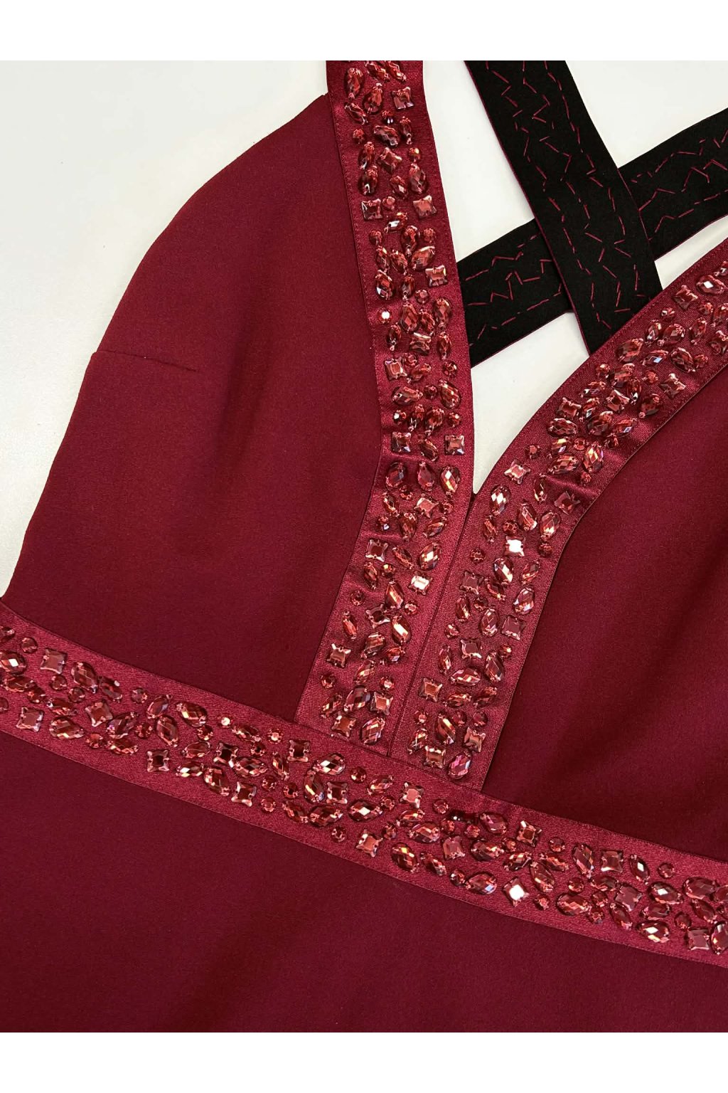 Poškodený tovar - Bordové spoločenské priliehavé šaty s kamienkami