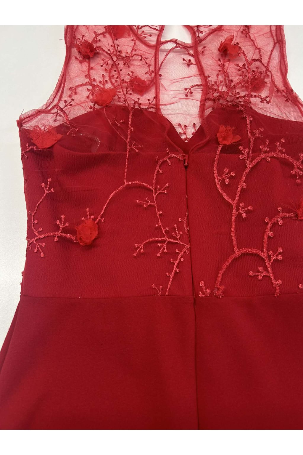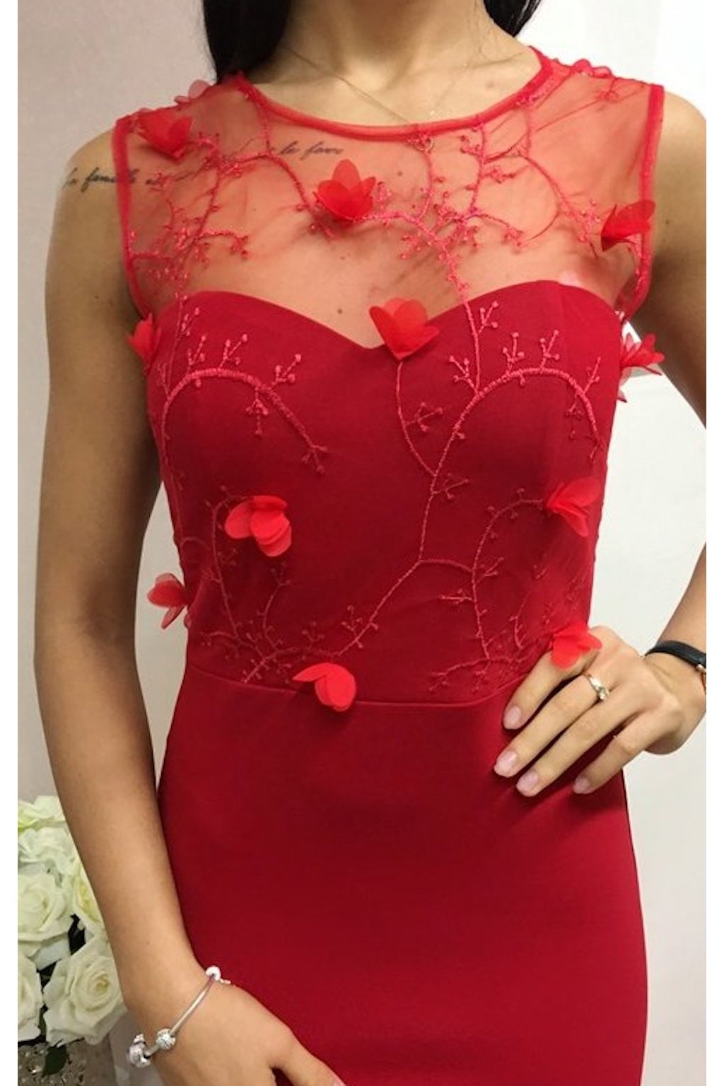 Priliehavé midi šaty v červenej farbe sú z elastického materiálu. Na vrchnej časti je našitý tyl, ktorý je zdobený výšivkami a romantickými srdiečkami. Vzadu majú zapínanie na zips.