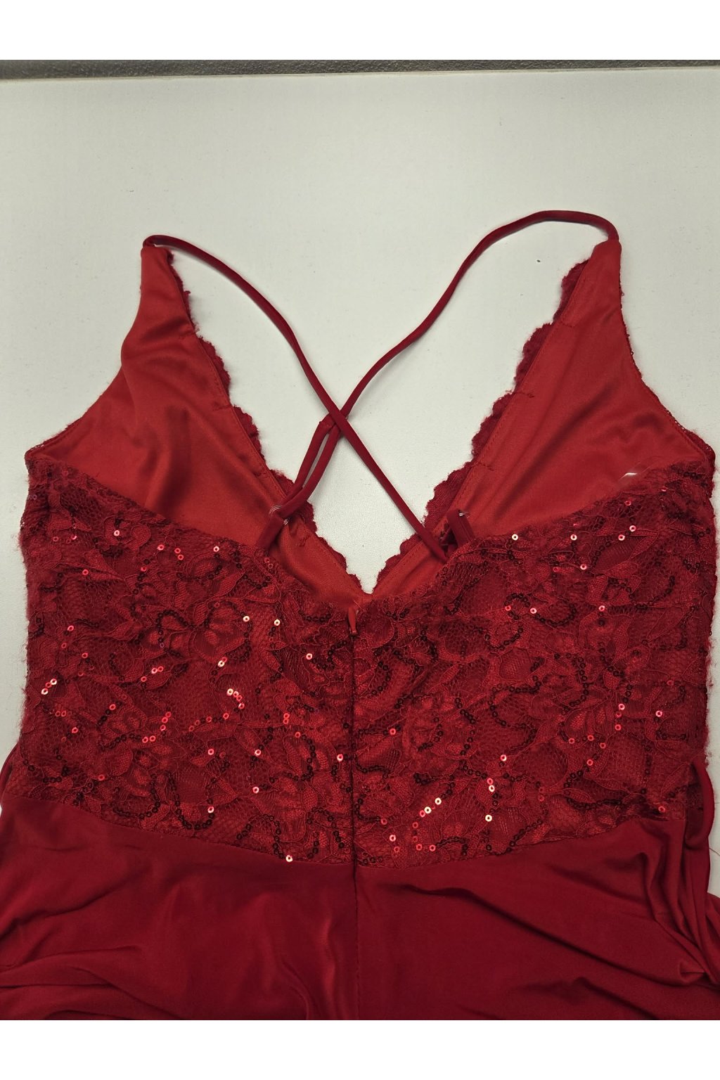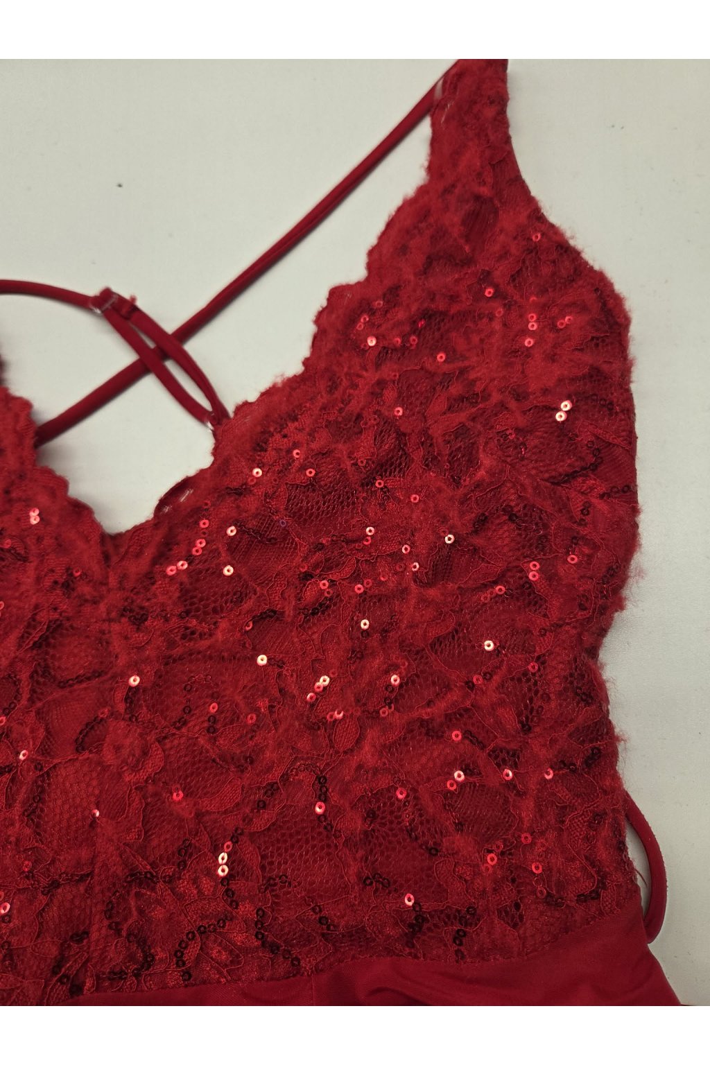 Poškodený tovar - Červené spoločenské šaty s krajkou a flitrami