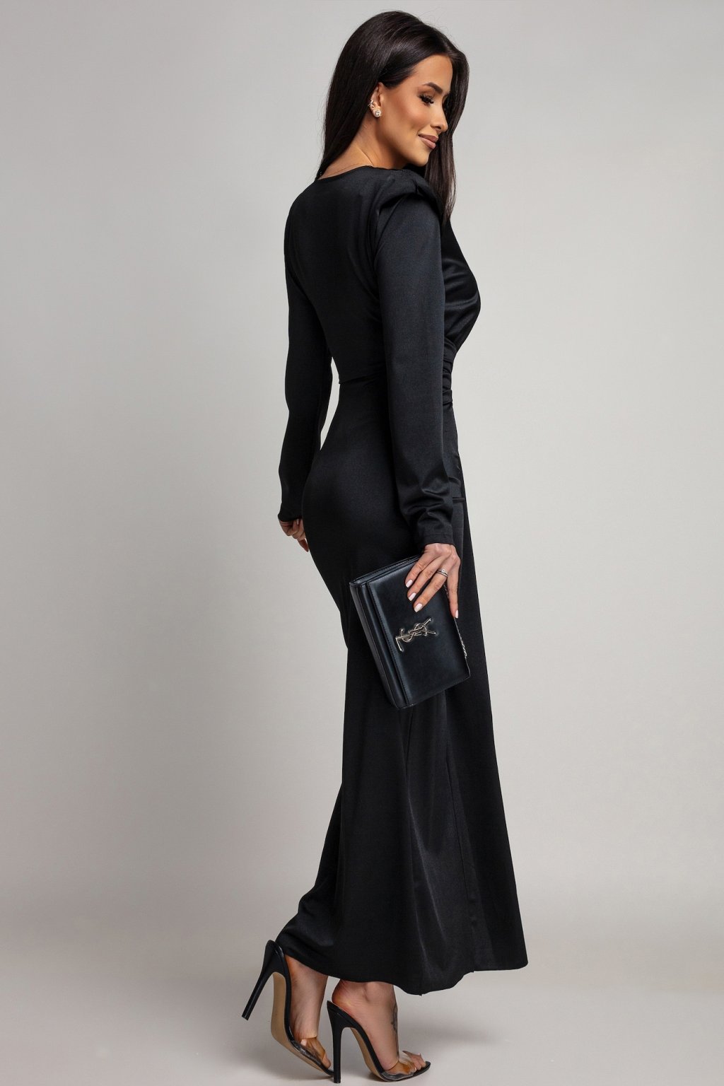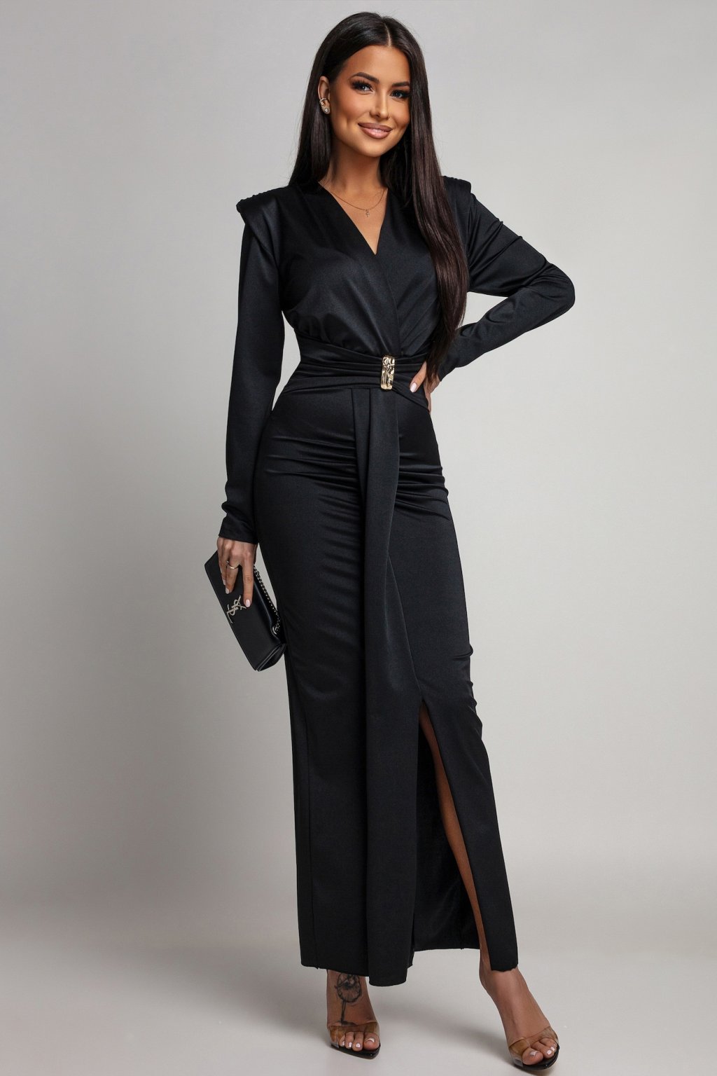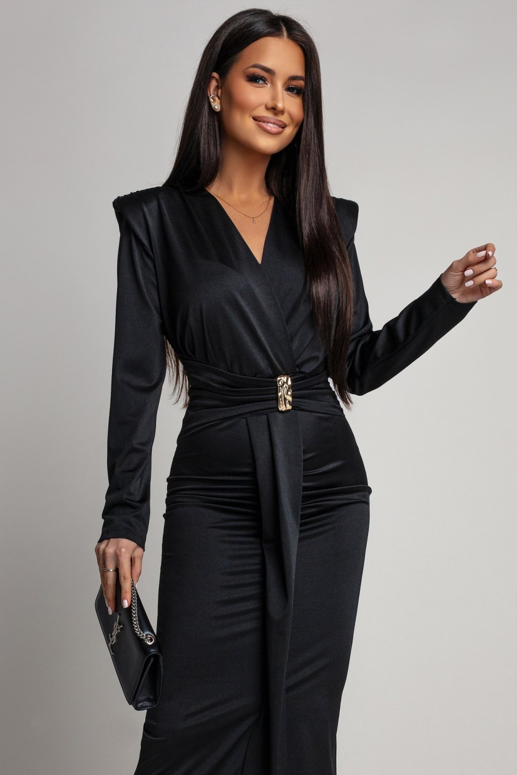 Aké šaty nazvať dokonalými, ak nie tieto? Hlbší, ale stále elegantný výstrih dodáva outfitu jemný nádych zvodnosti, zatiaľ čo vkusná zlatá aplikácia a vystužené ramená vyžarujú nadhľad a dominanciu. Na spoločenskej udalosti vstúpi do miestnosti sebavedomá dáma s gráciou a zmyslom. Materiál šiat je elastický.