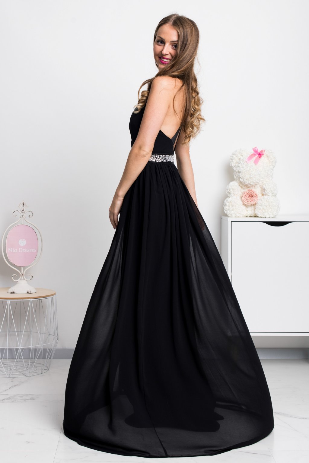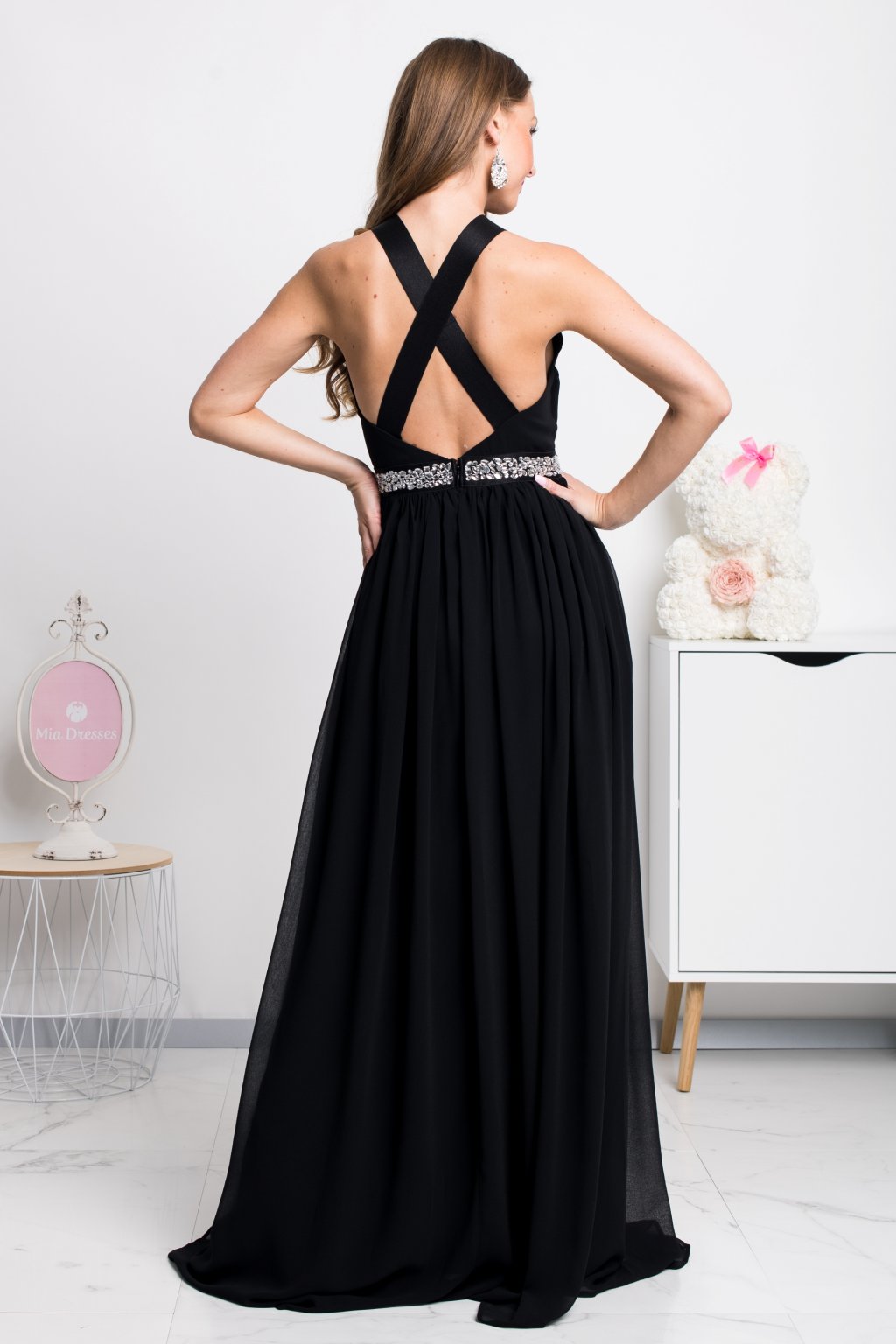 Tieto šaty oživia ženskú krásu a jedinečnosť nielen vďaka ľahunkému šifónu, ale taktiež blýskavým kamienkom, ktoré lemujú pás. Kamienky sú vždy zárukou pútavého dojmu. Odhalený chrbát je vyzývavým, ale zaiste vkusným prvkom spoločenských šiat. Pásy, ktoré chrbát obopínajú sú elastické a šaty sa zapínajú vzadu na sukni zipsom.