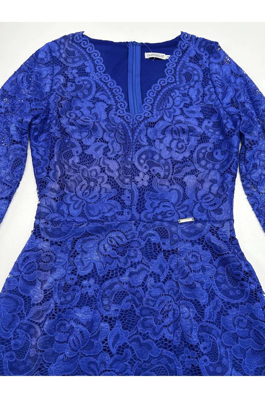 Poškodený tovar- Modré čipkované krátke šaty s dlhými rukávmi