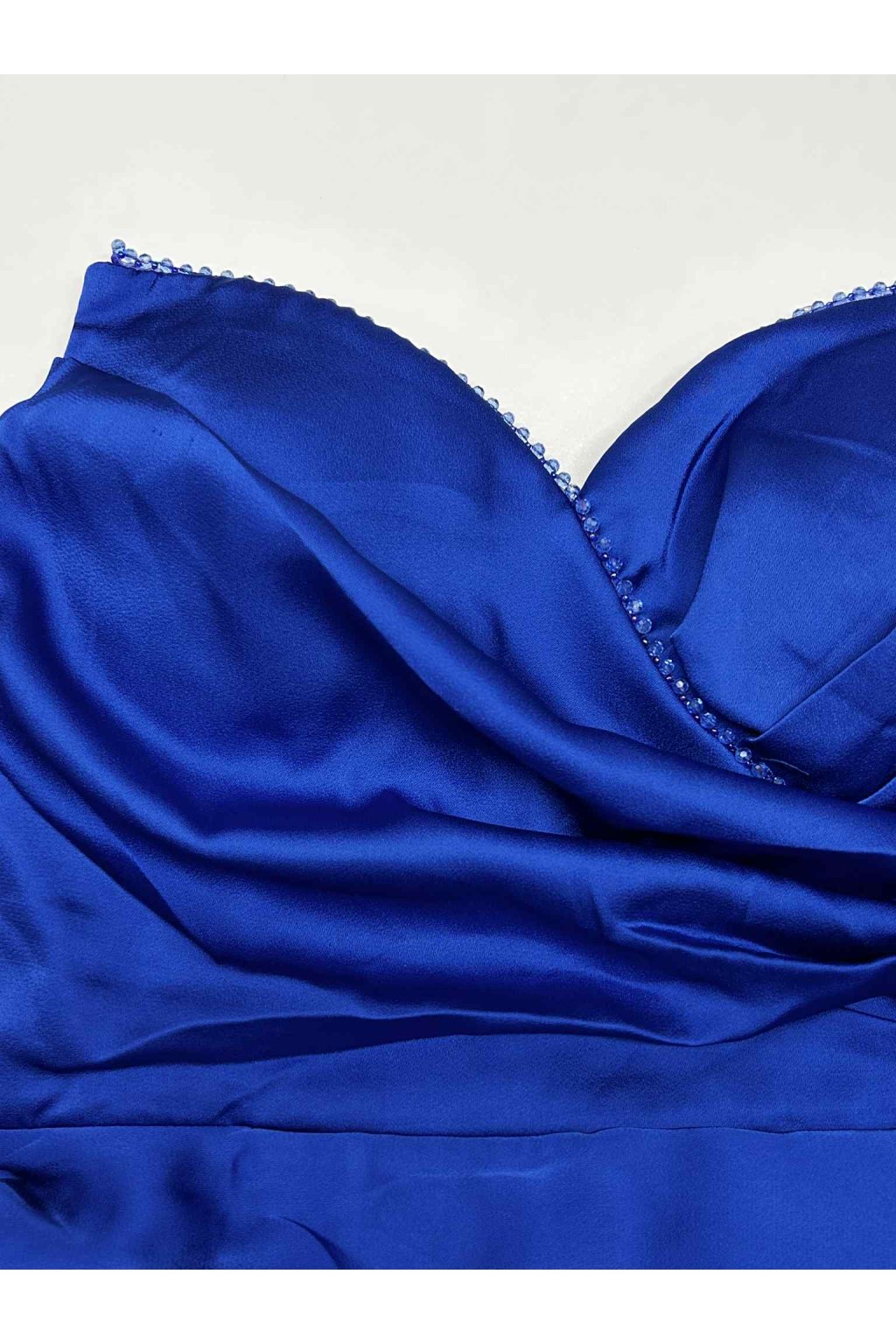 Satén je zárukou podmanivého vzhľadu s veľkou dávkou elegancie a noblesy a tieto saténové šaty nie sú výnimkou. K dokonalému vzhľadu prispeje rozparok a decentné kamienky, ktoré zdobia dekolt. Šaty sú na prsiach vystužené, na chrbte majú šnurovanie a na sukni sa zapínajú zipsom. Súčasťou šiat sú odnímateľné ramienka.