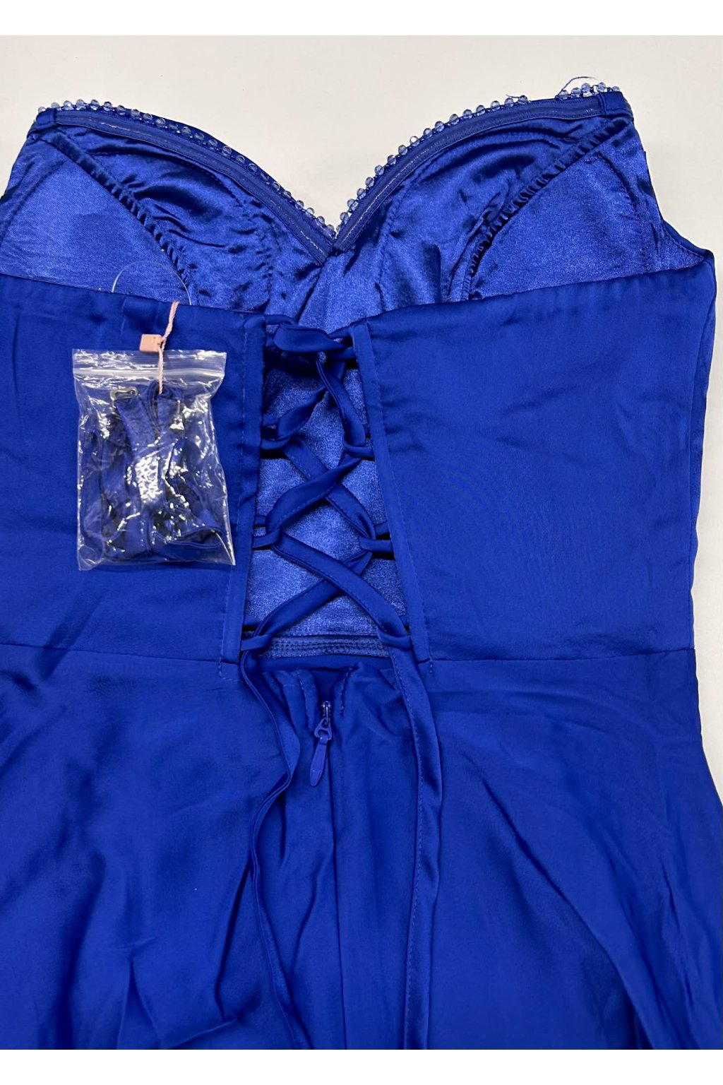 Poškodený tovar - Modré saténové šaty s rozparkom